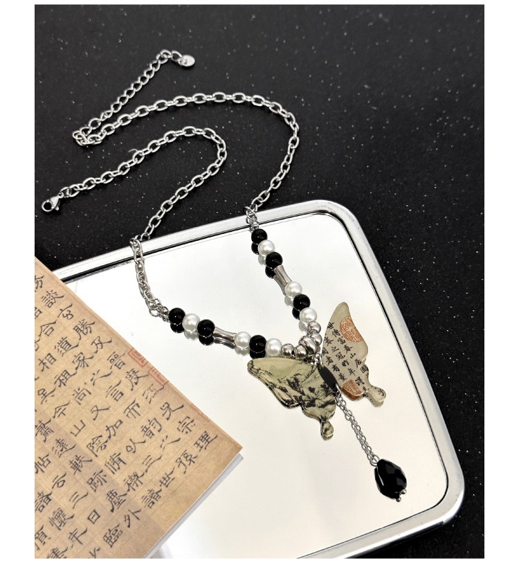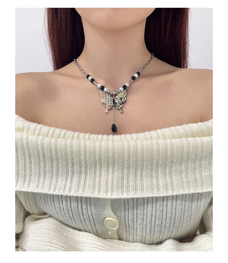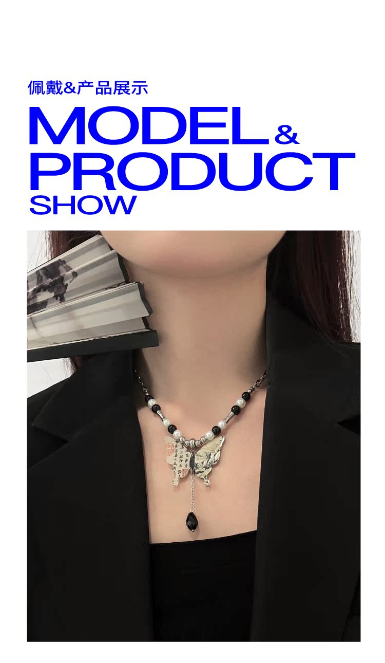 KANSAI新款黑色鏤空蝴蝶項鏈女小眾甜酷高級感珍珠拼接氣質配飾品