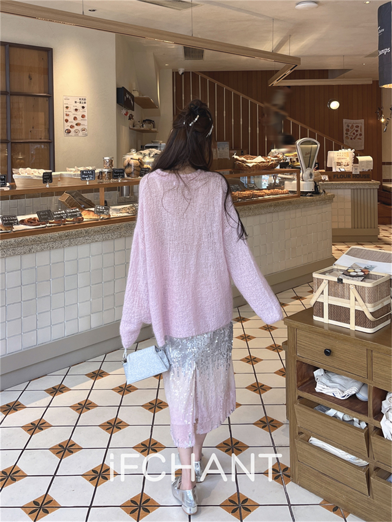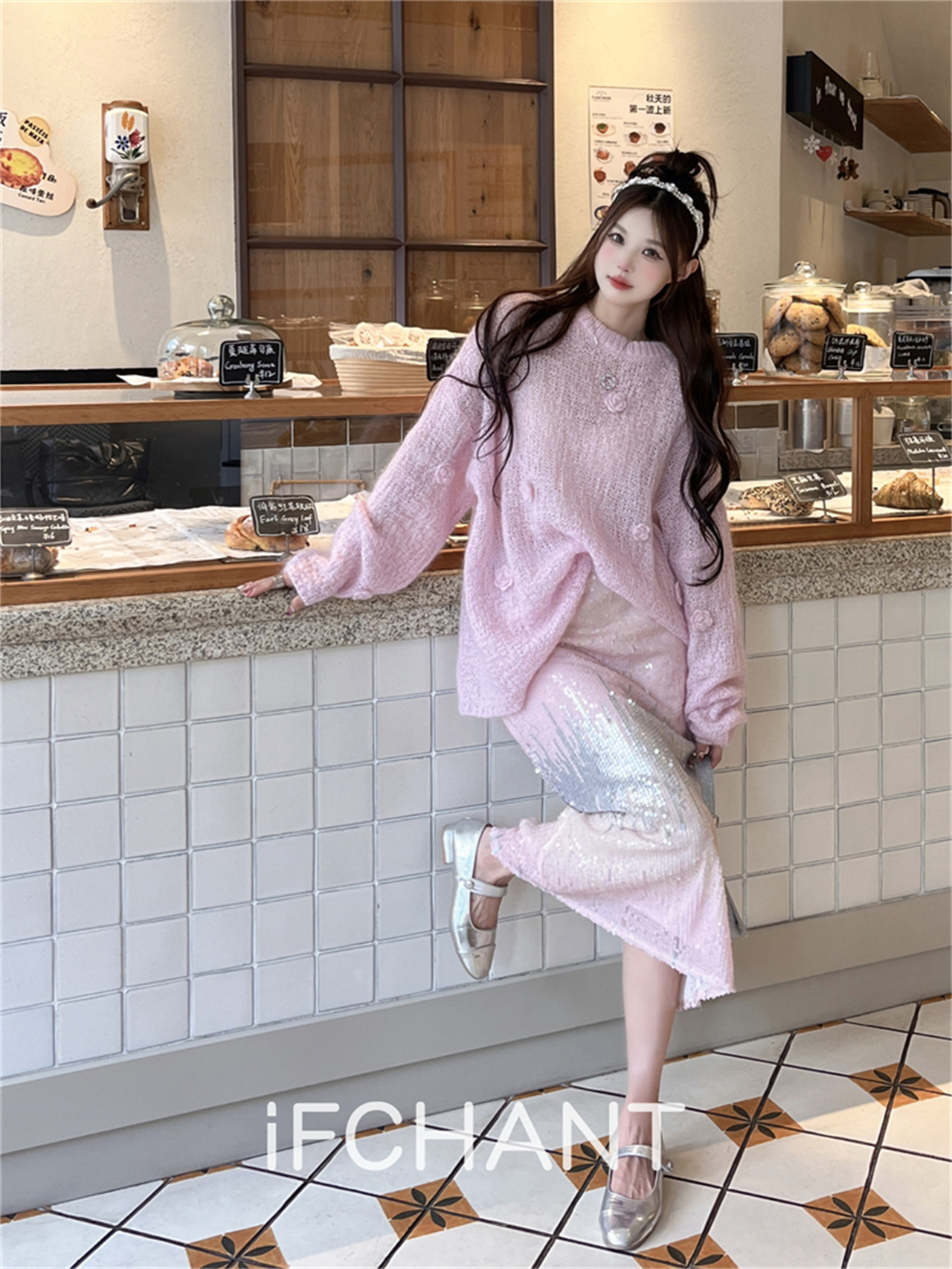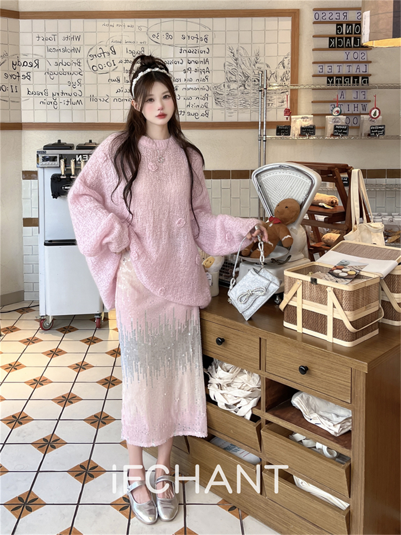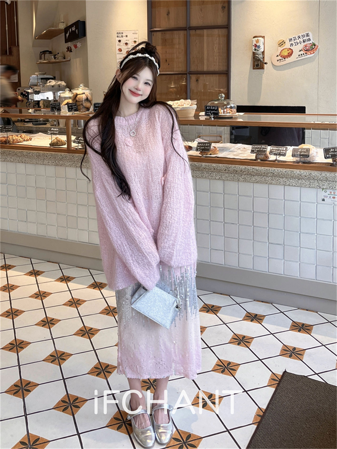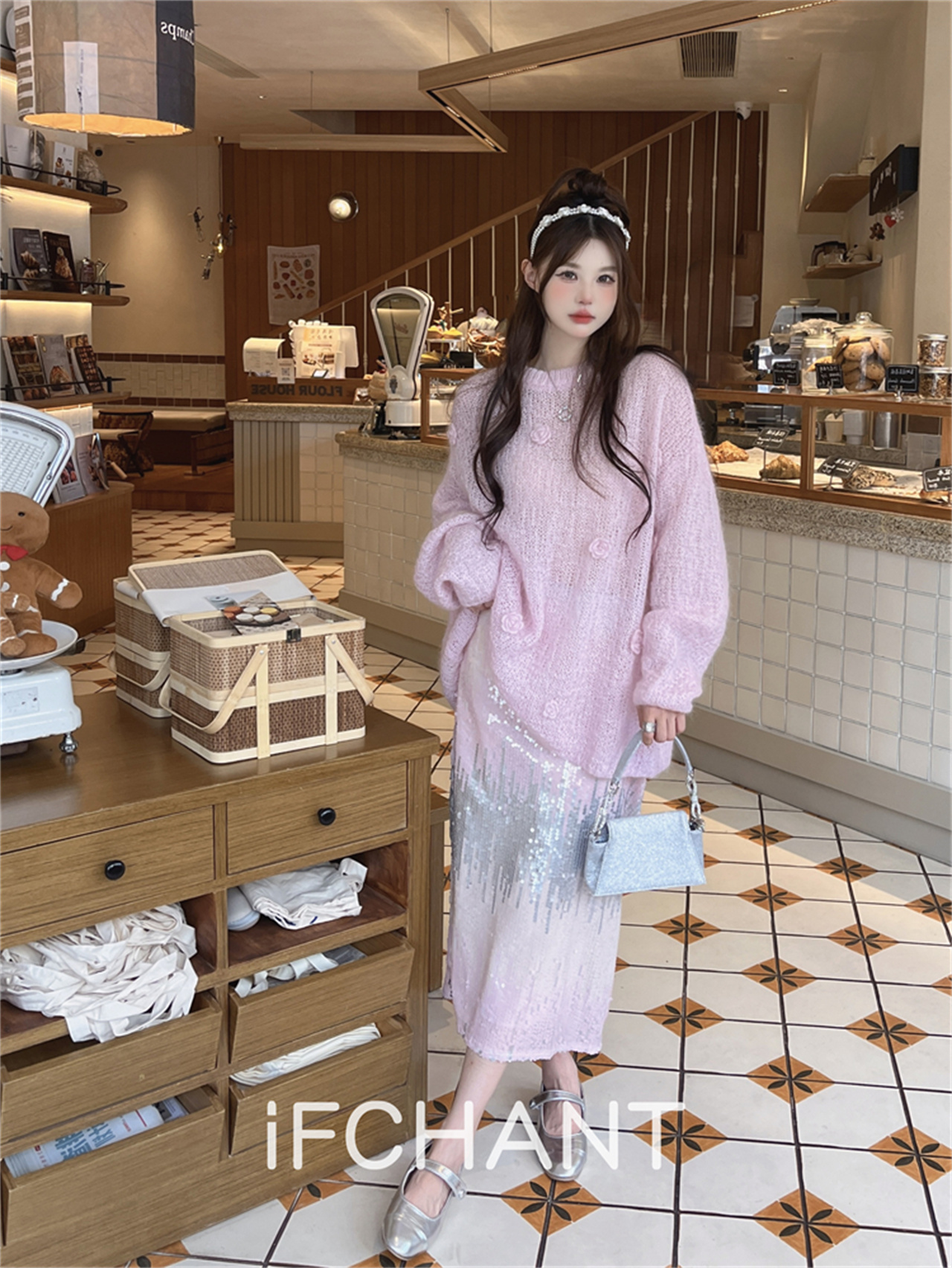 iFCHANT 23秋季新款馬海毛甜美花朵慵懶上衣珠片人魚姬漸變半裙
