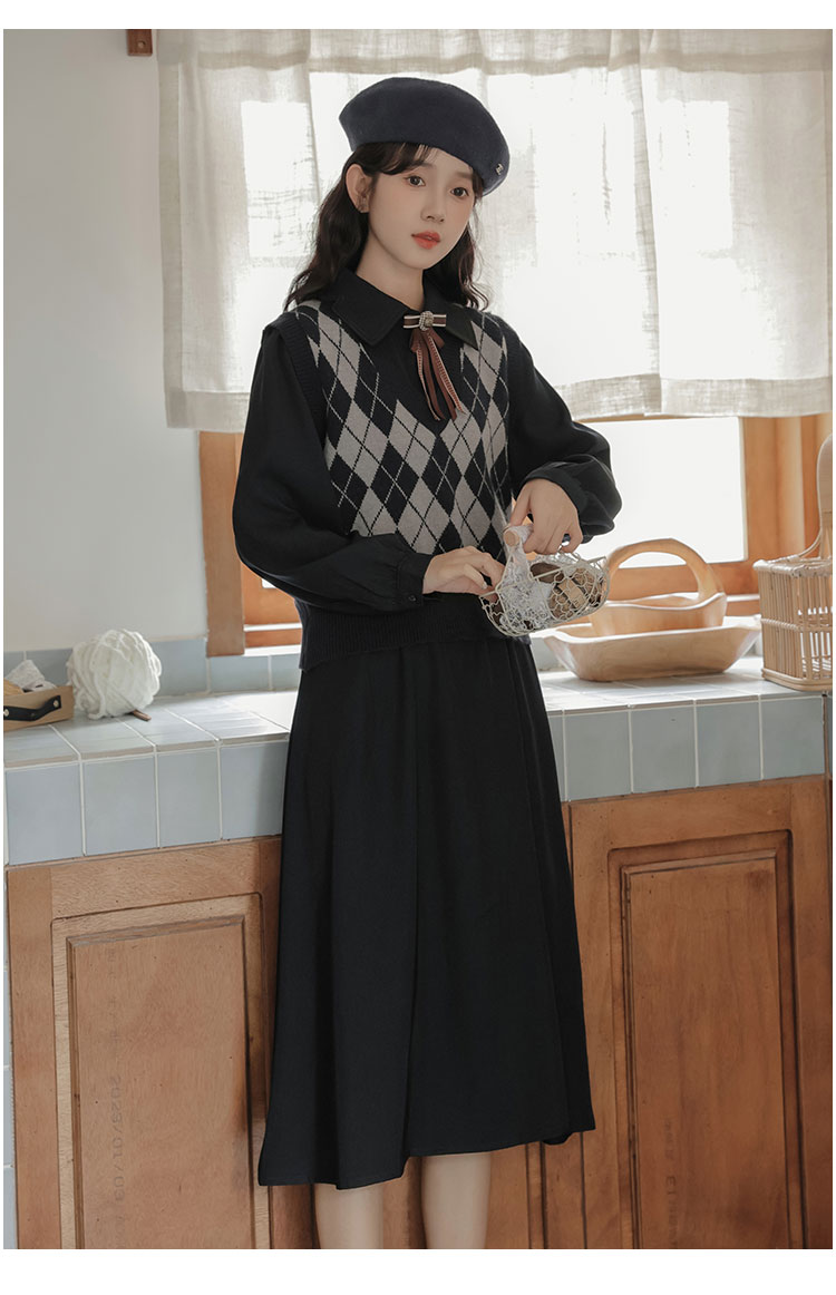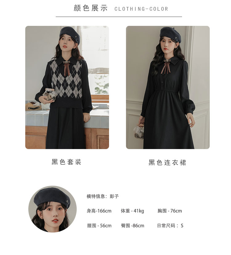 法式復古收腰黑色連衣裙女秋冬新款針織馬甲顯瘦氣質兩件套裝裙子