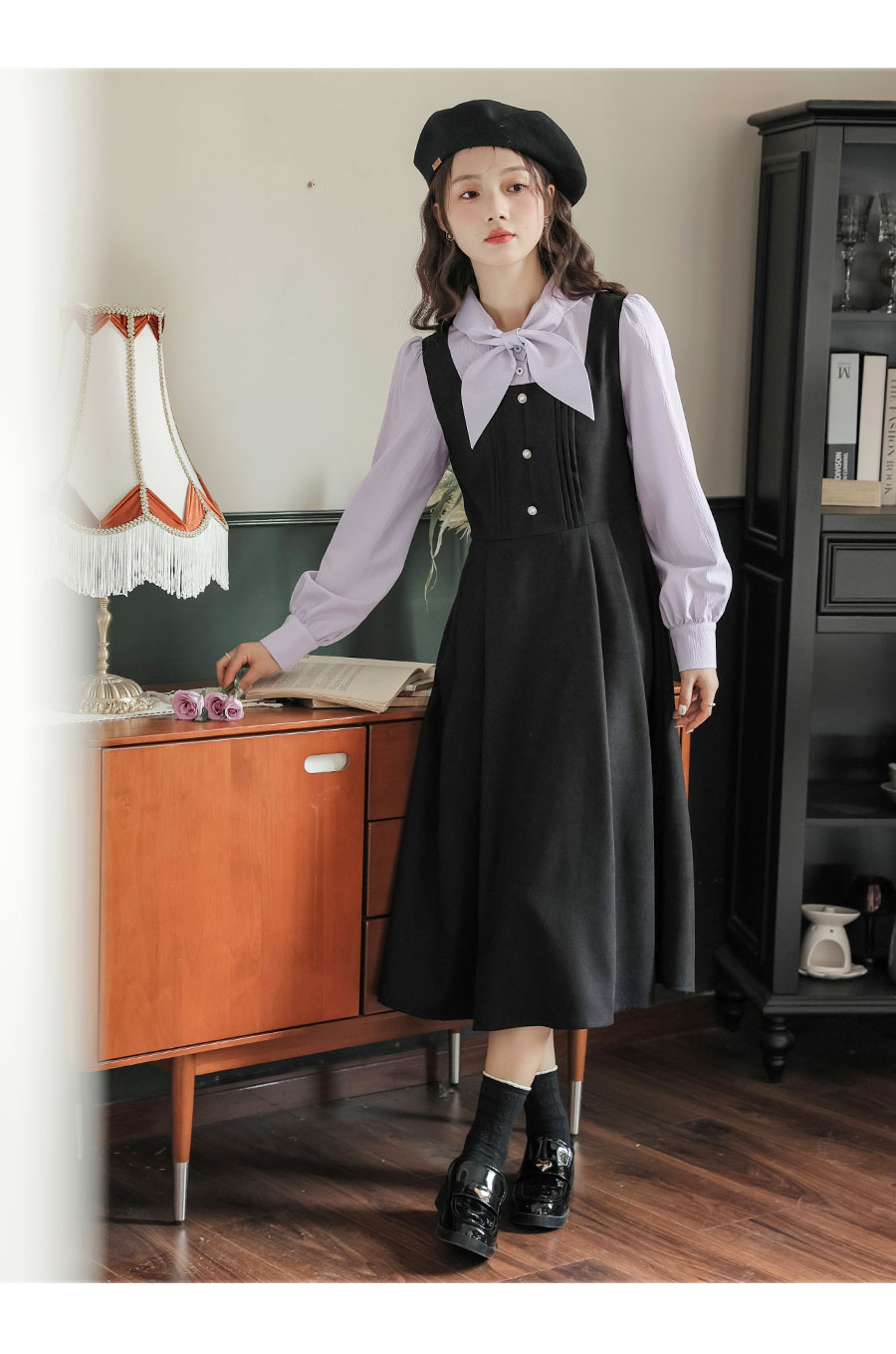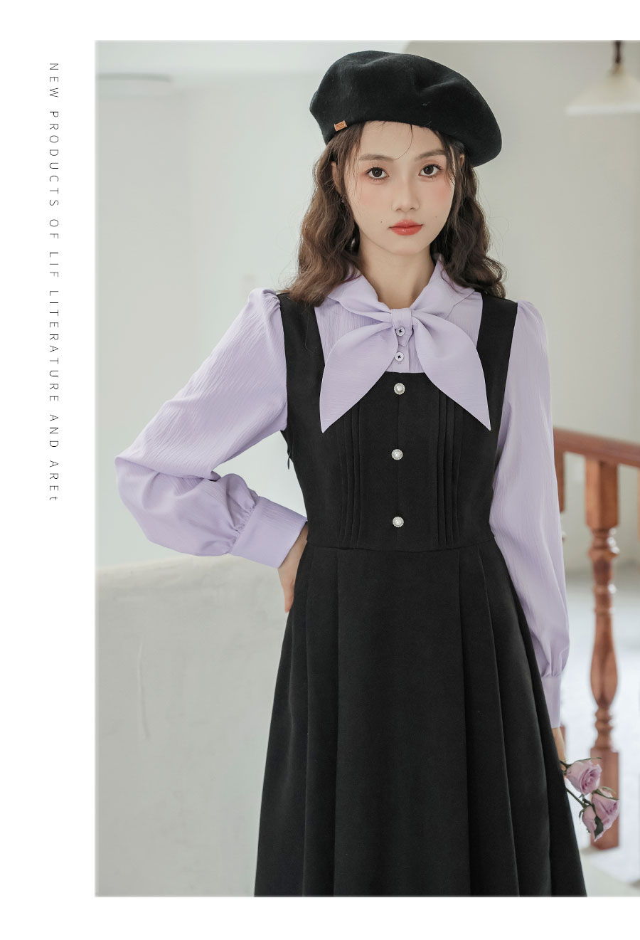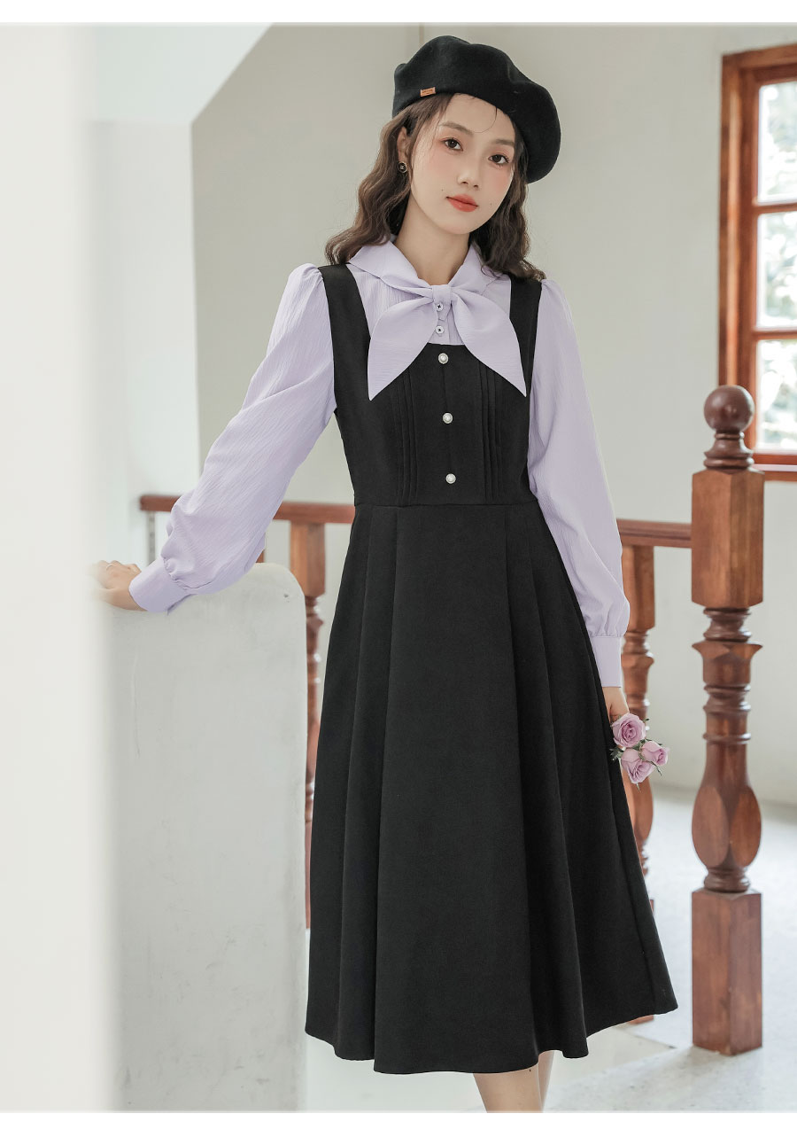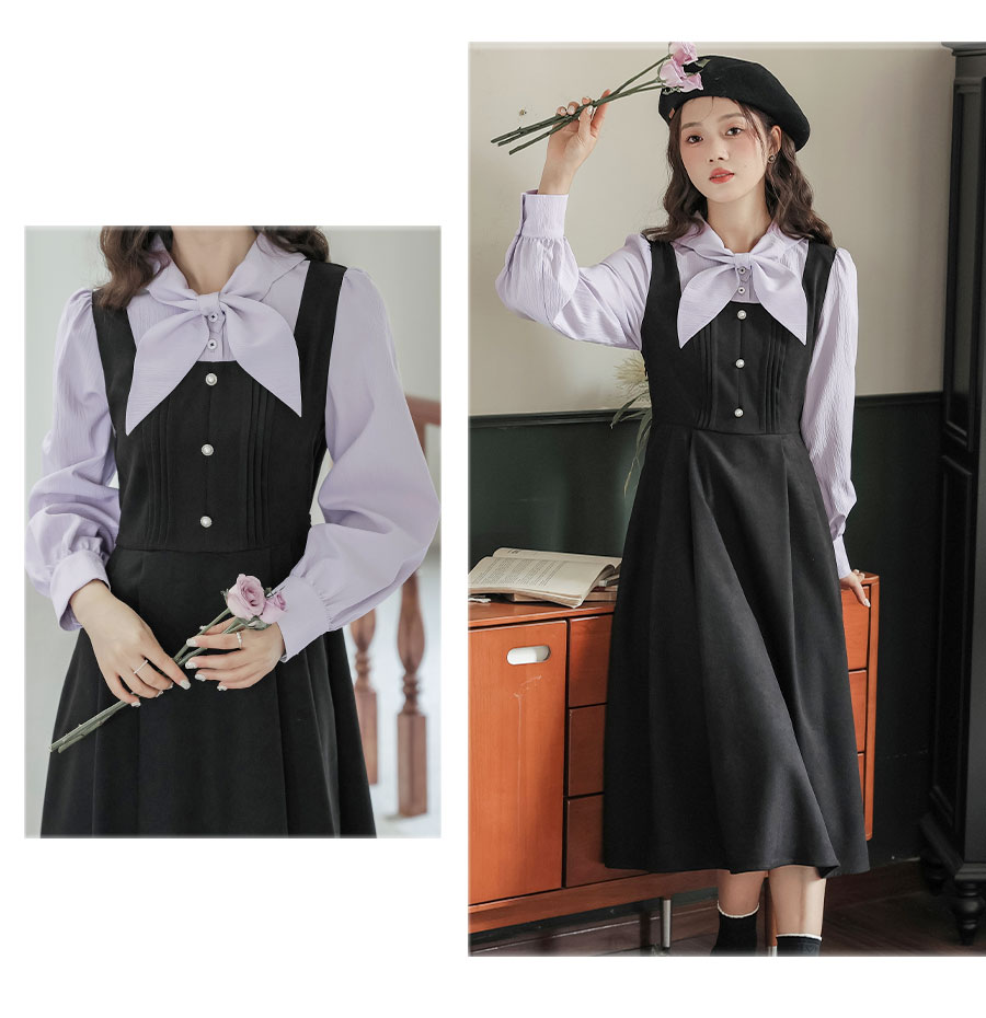 法式復古蝴蝶結連衣裙女2023新款秋季學院風減齡氣質收腰黑色裙子