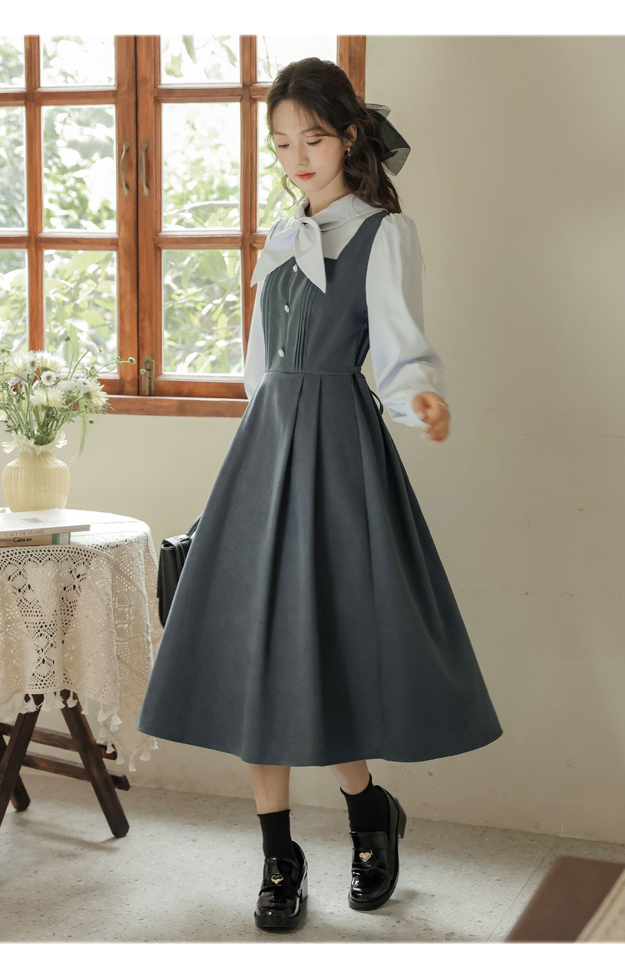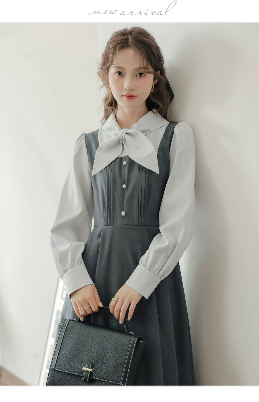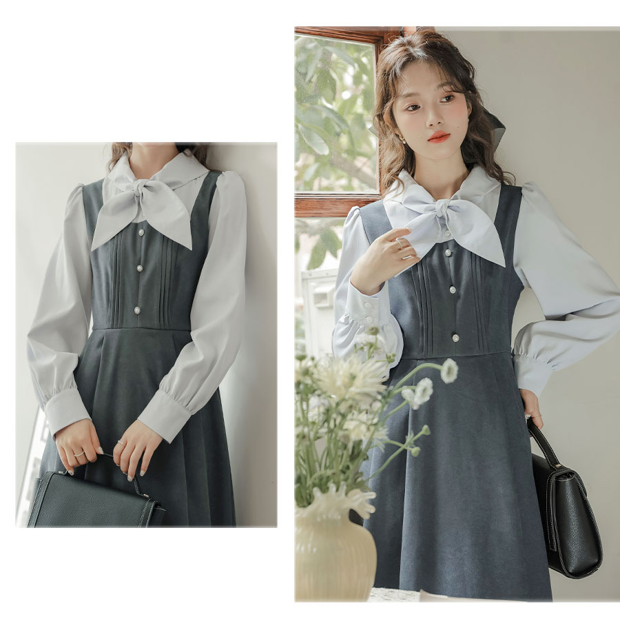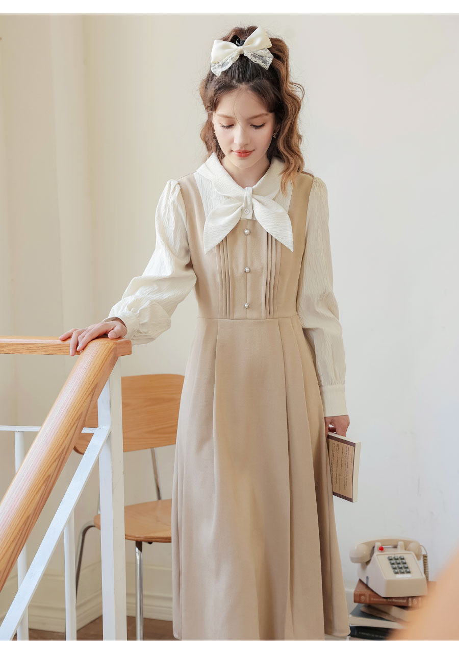 法式復古蝴蝶結連衣裙女2023新款秋季學院風減齡氣質收腰黑色裙子