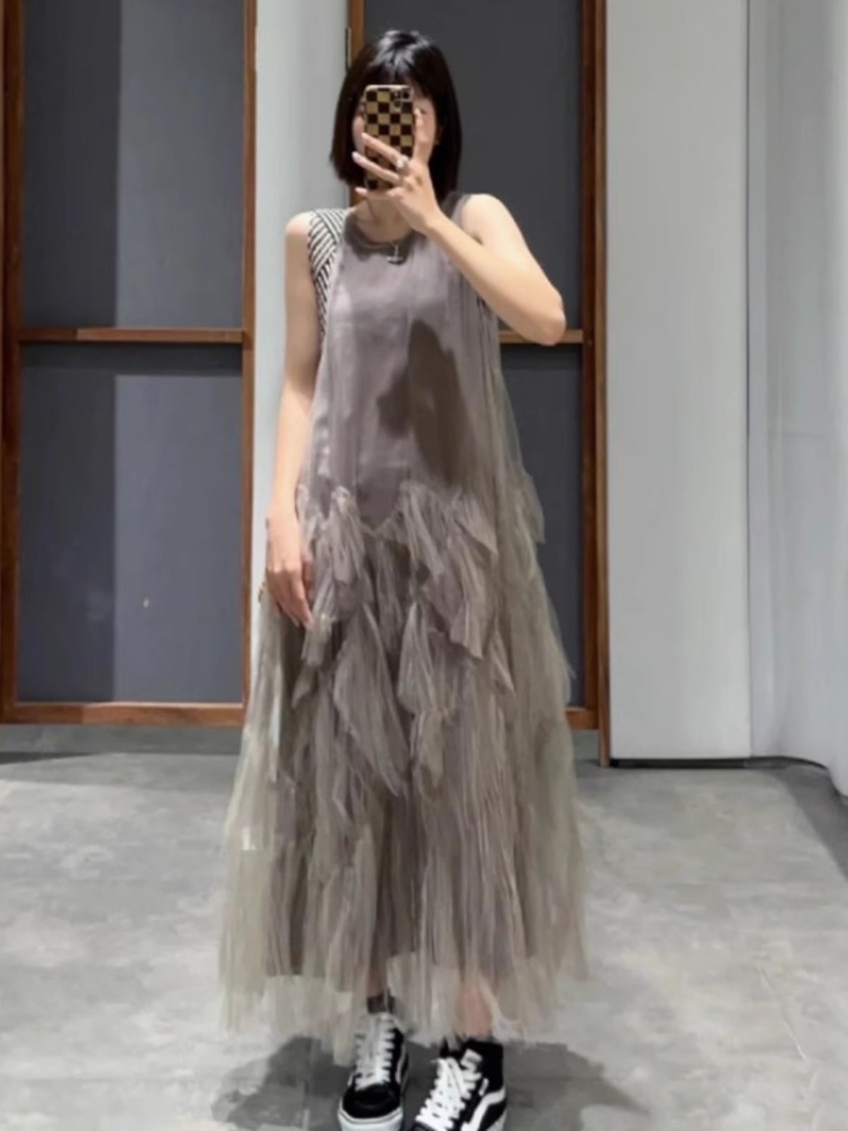 原廠現貨 2023年秋季新款 中長款無袖 網紗連衣裙 兩件套