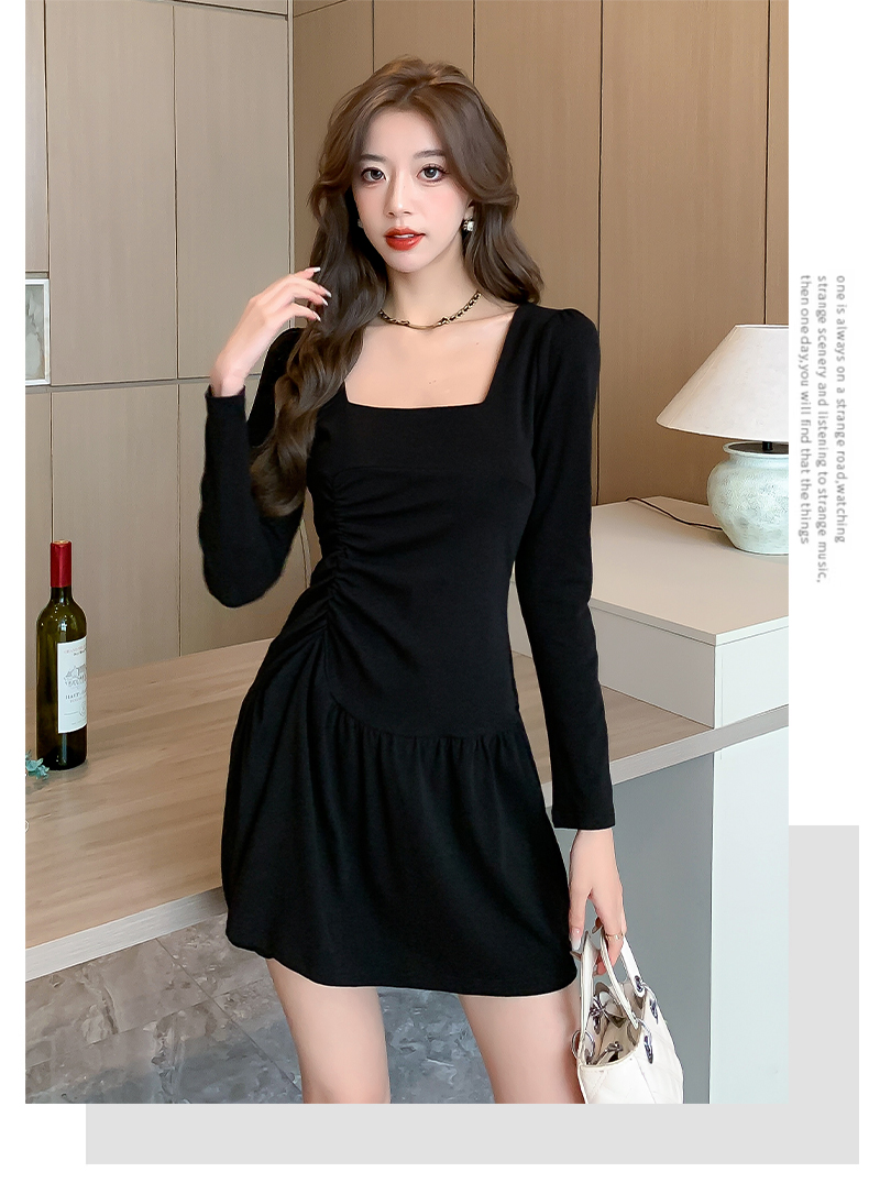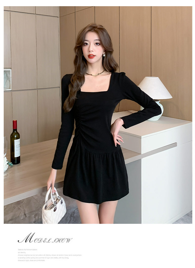 女人味辣妹露背方領連衣裙長袖性感氣質褶皺遮肉顯瘦緊身包臀裙子