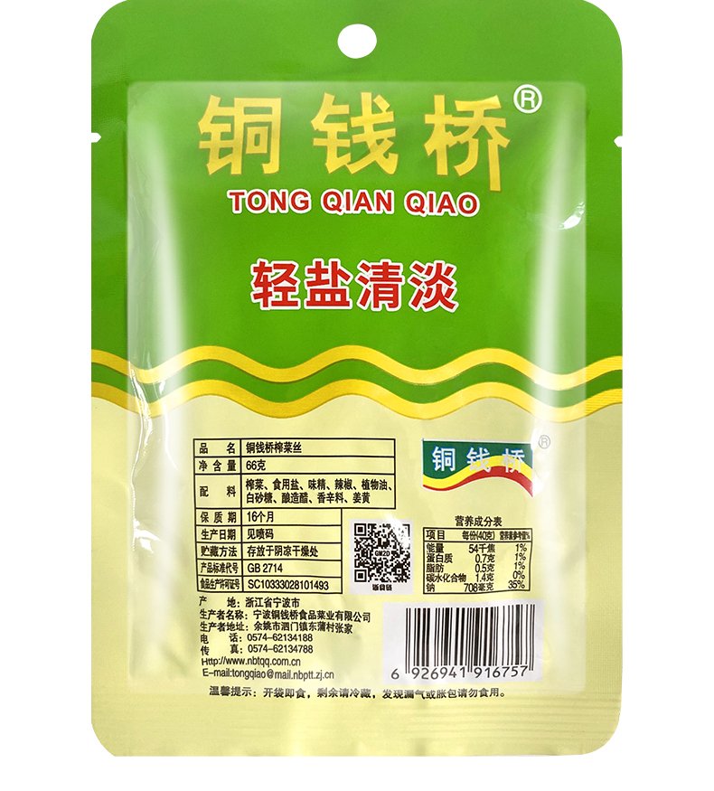銅錢橋余姚特產0添加榨菜絲66g/袋小包裝學生輕鹽下飯菜咸菜
