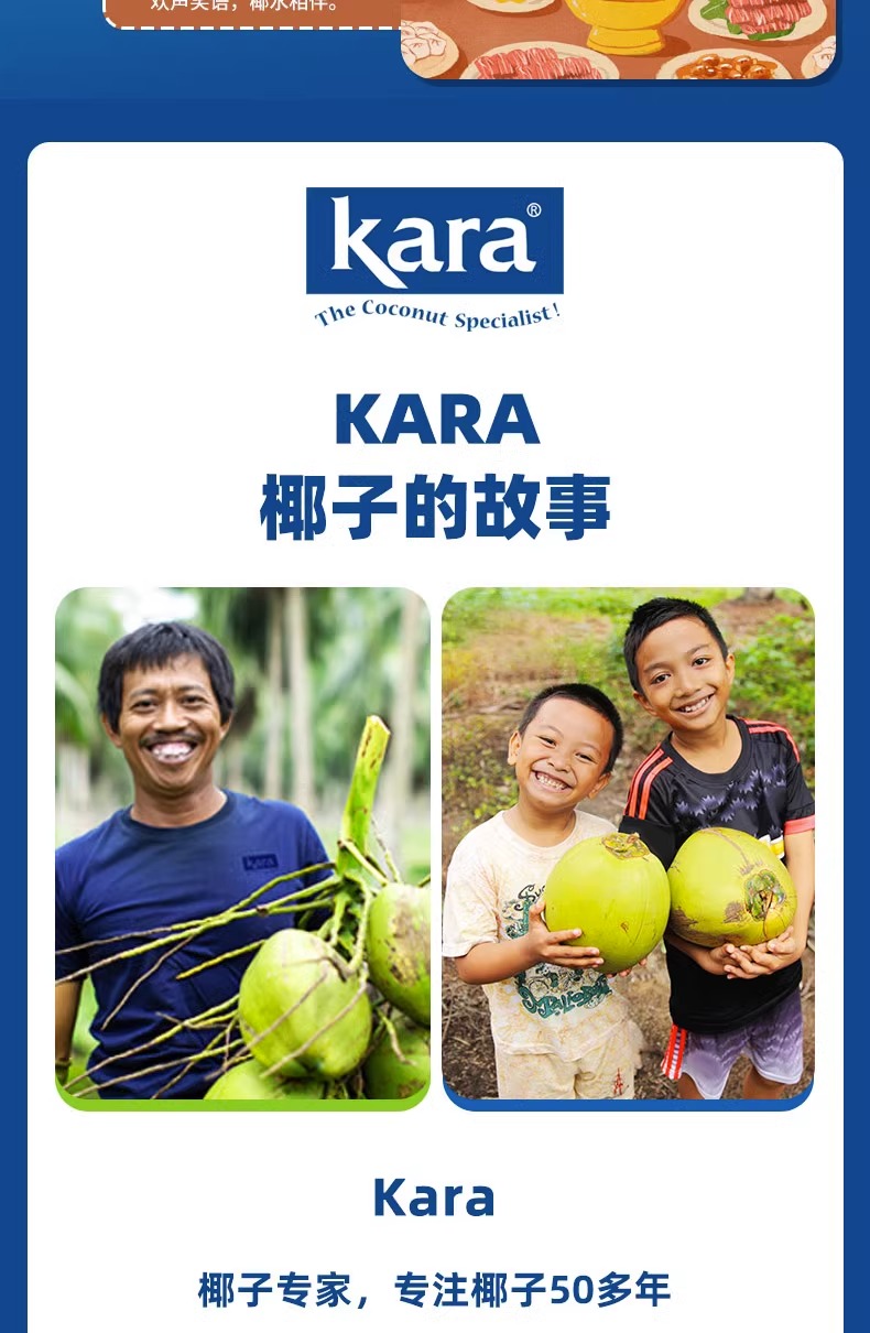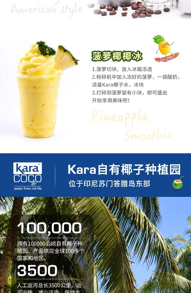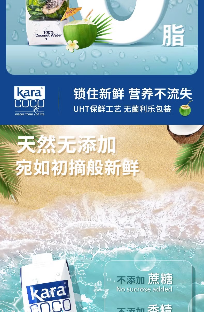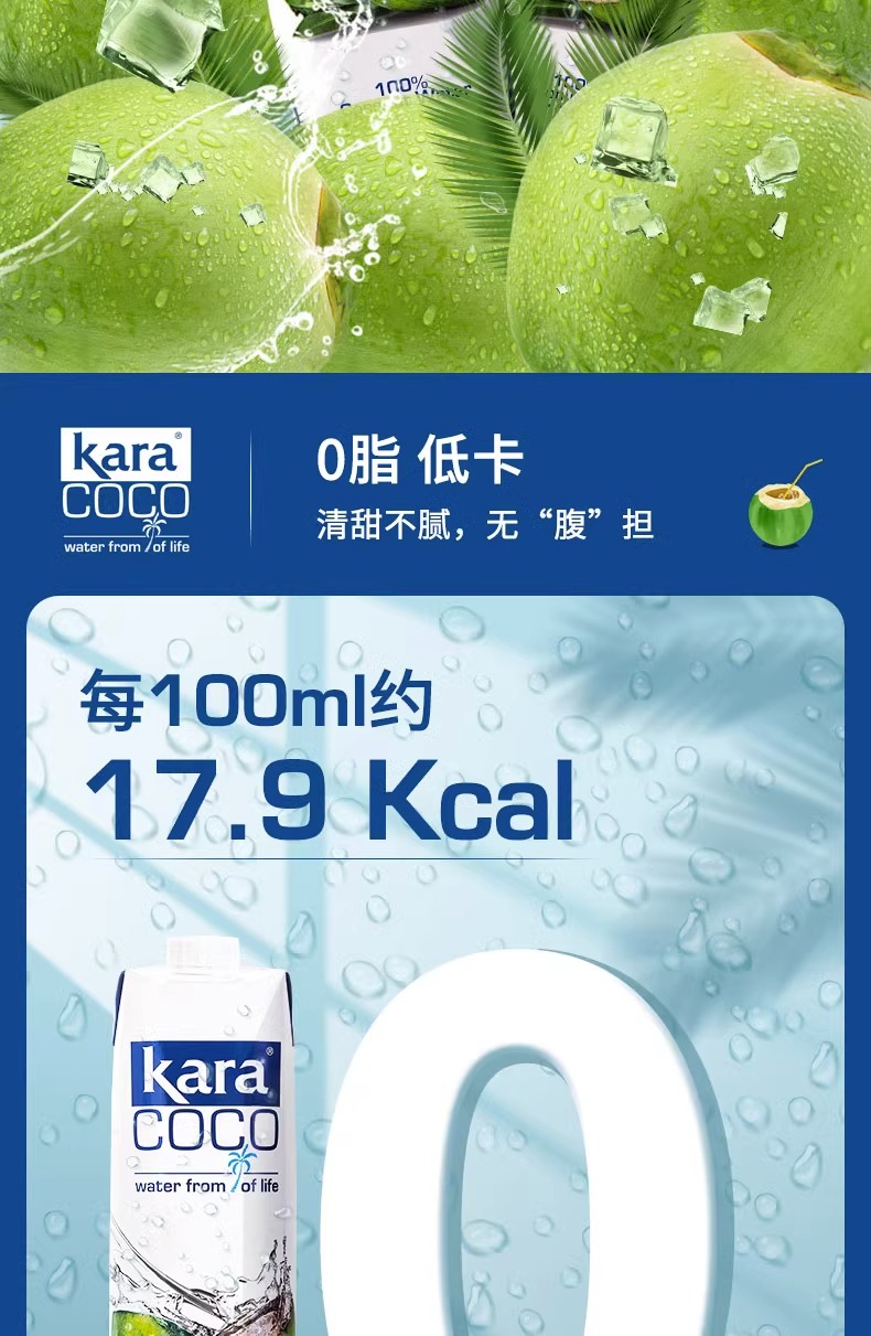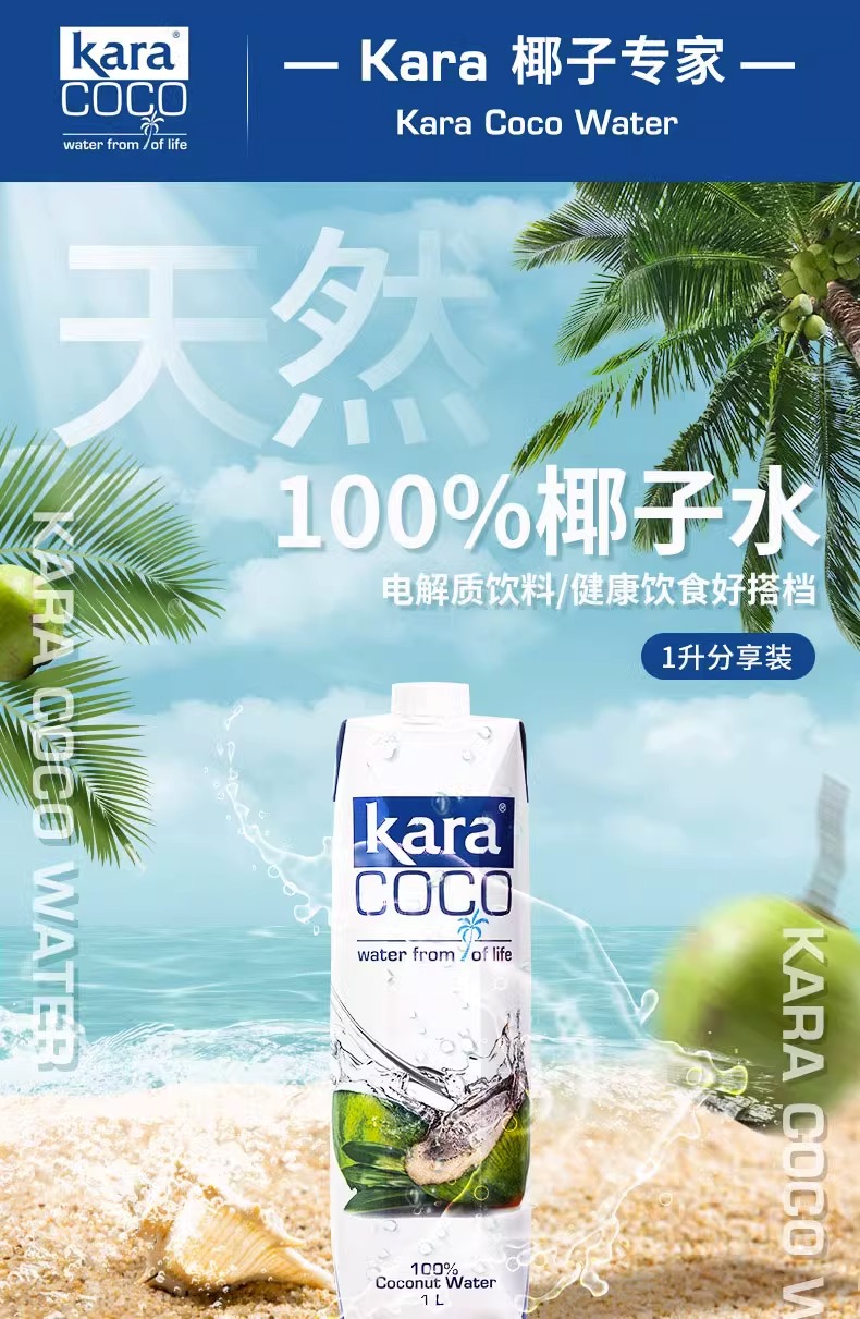 Kara100%椰子水1L*2盒補充電解質印尼進口椰青水果汁飲料0脂低卡