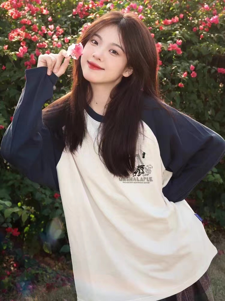 2023秋季撞色插肩長袖t恤女百搭學生甜辣小上衣服純棉秋冬打底衫