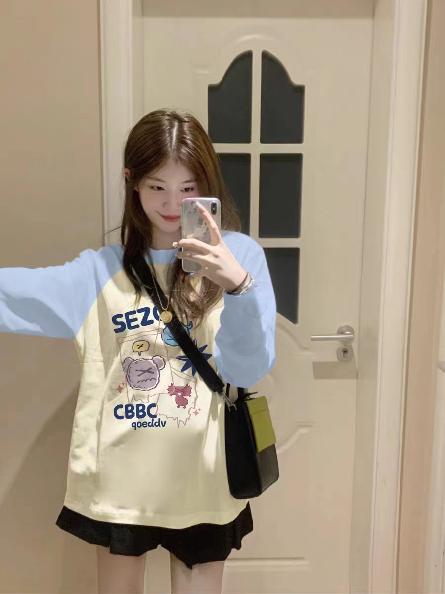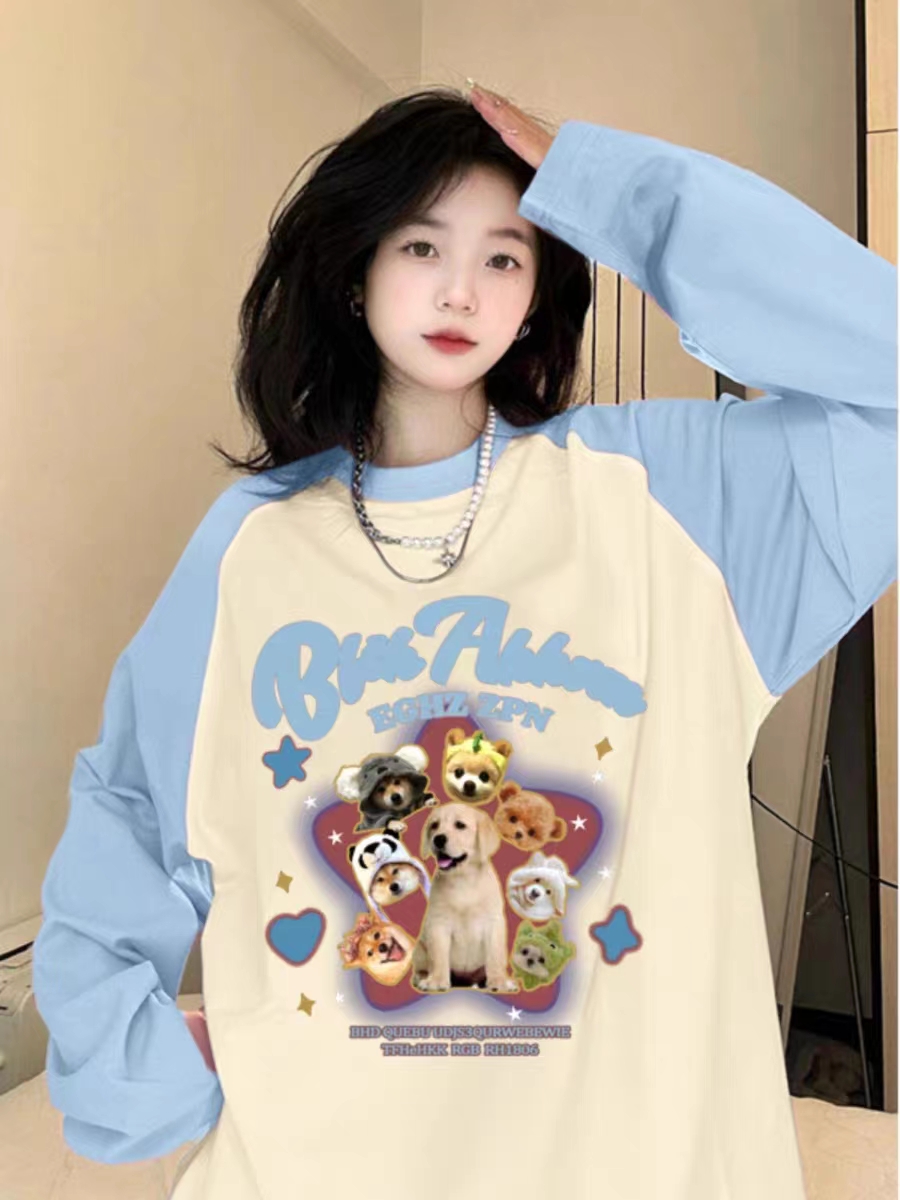 撞色插肩袖T恤女秋季2023新款美式復古卡通印花寬松長袖上衣
