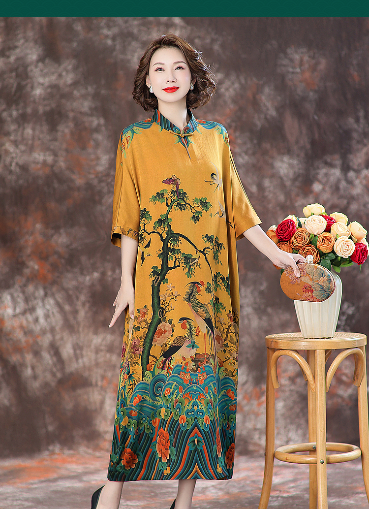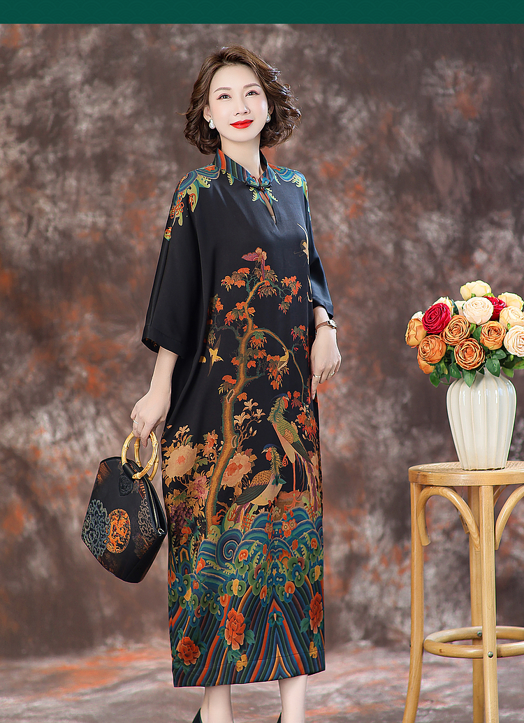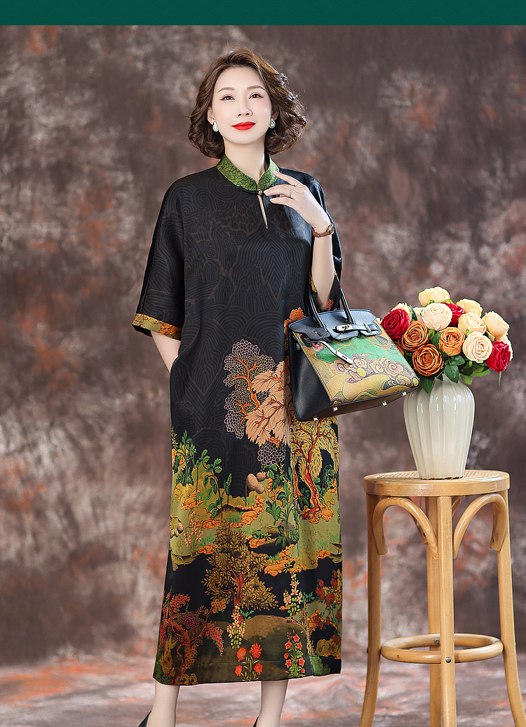 齊黛高端花羅香云紗真絲旗袍連衣裙女印花氣質盤扣媽媽桑蠶絲裙