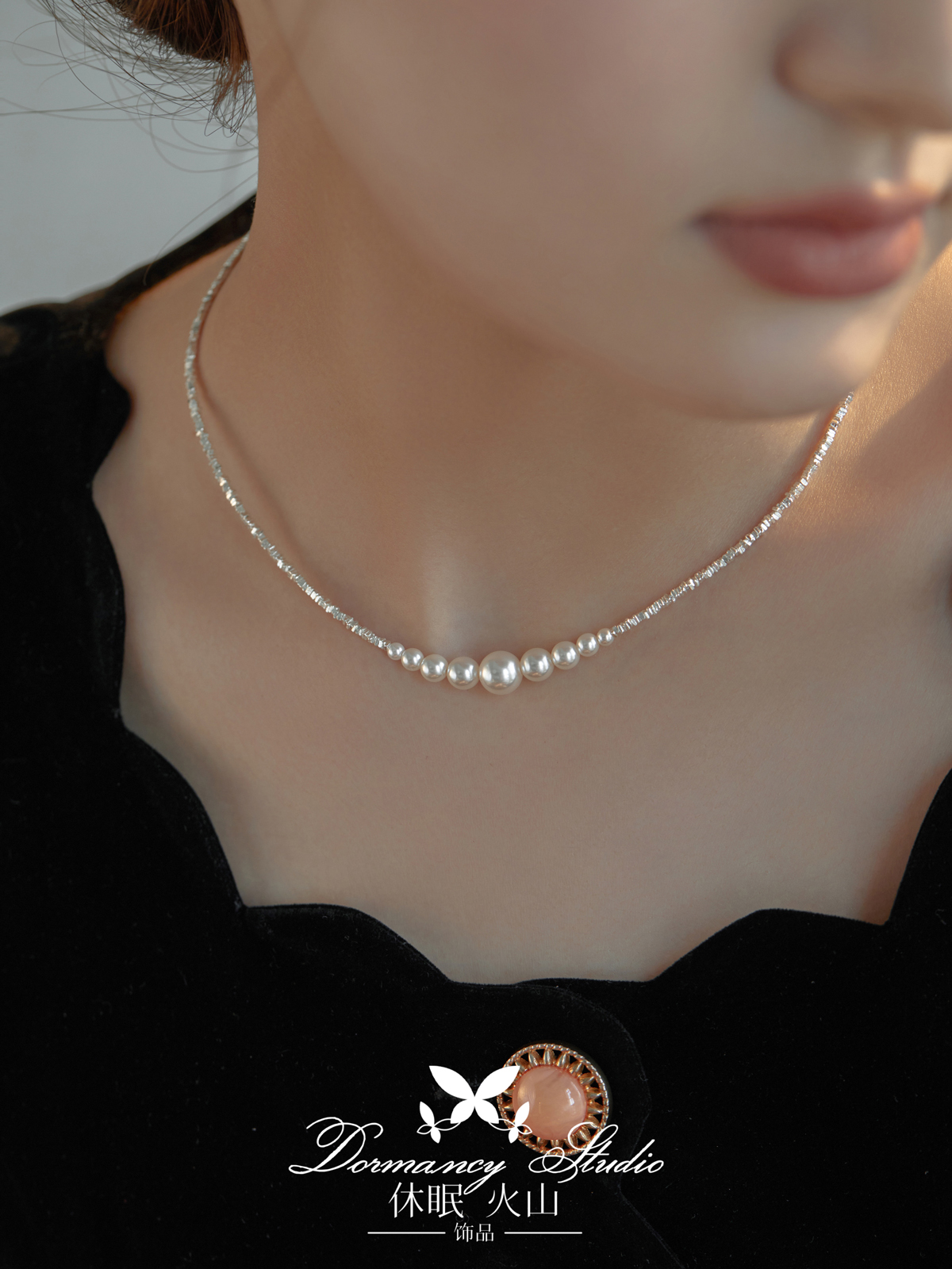「月光戀曲」碎銀子施家正圓強光珍珠項鏈漸變串珠純銀鎖骨鏈頸鏈