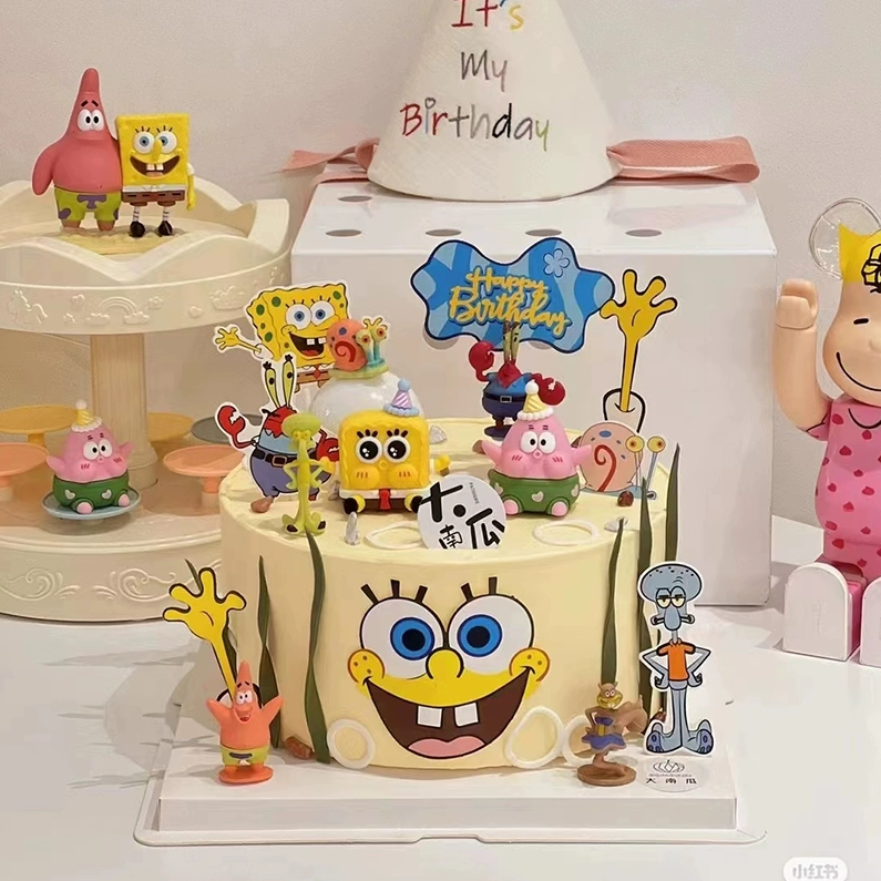 網紅海綿寶寶蛋糕裝飾插件卡通兒童生日派大星章魚哥蟹老板擺件