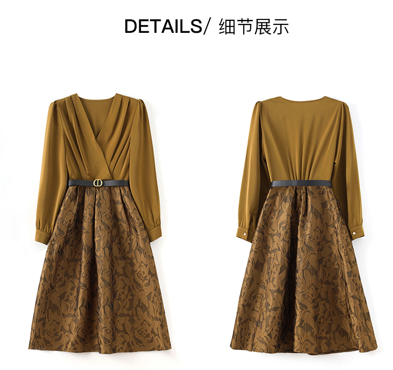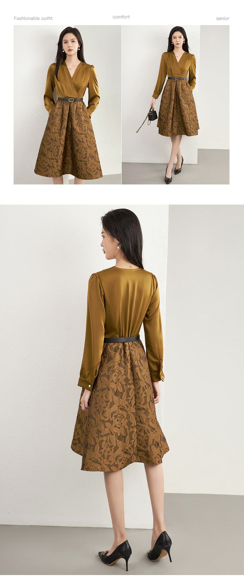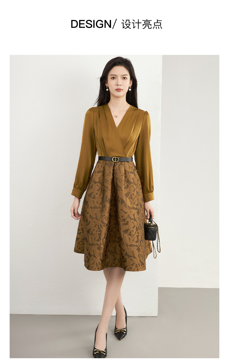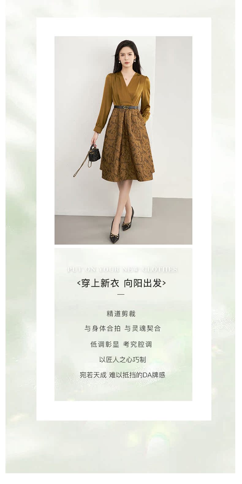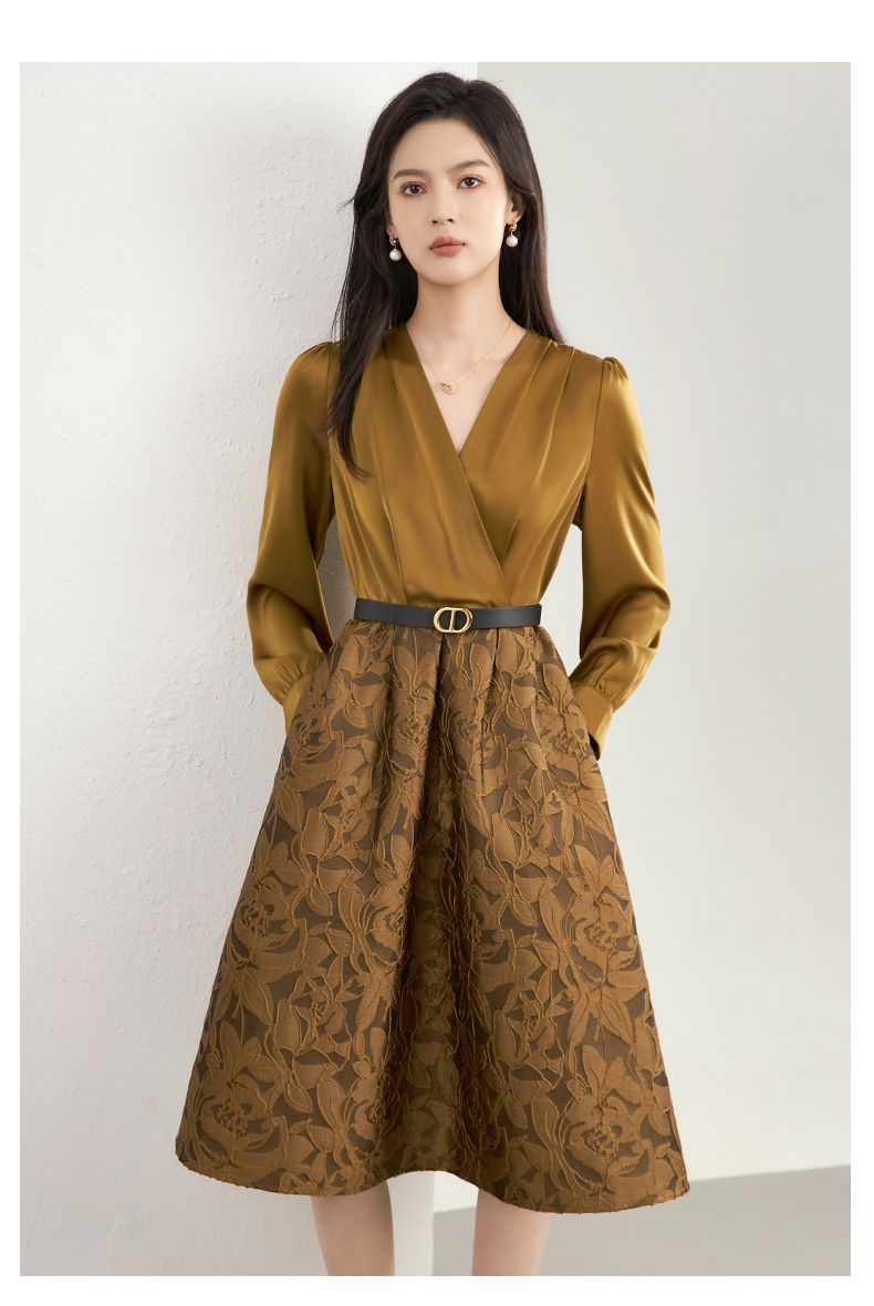 高級感輕奢裙子女秋冬新款優雅知性美V領長袖提花大擺氣質連衣裙
