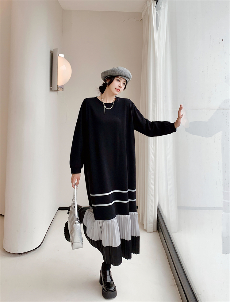 拼接撞色荷葉邊連衣裙女2023秋冬新款胖mm圓領長袖打底t恤長裙子