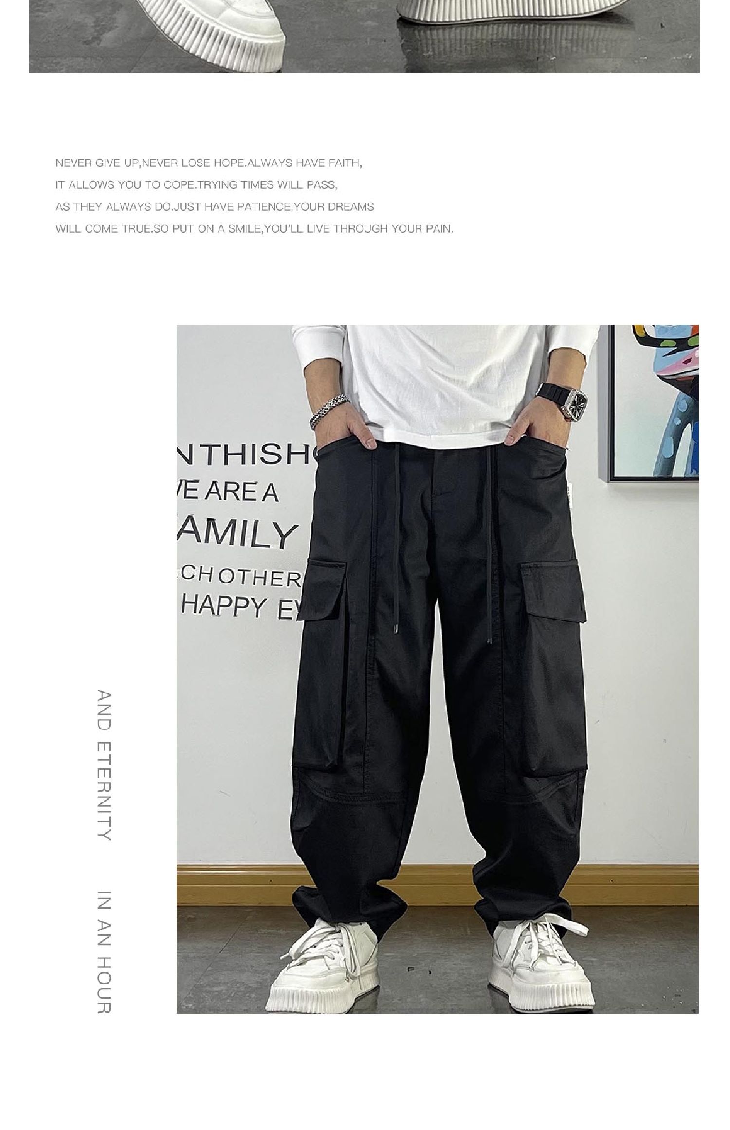 秋季新款多口袋男士工裝褲寬松直筒抽繩美式休閑大口袋機能風男褲