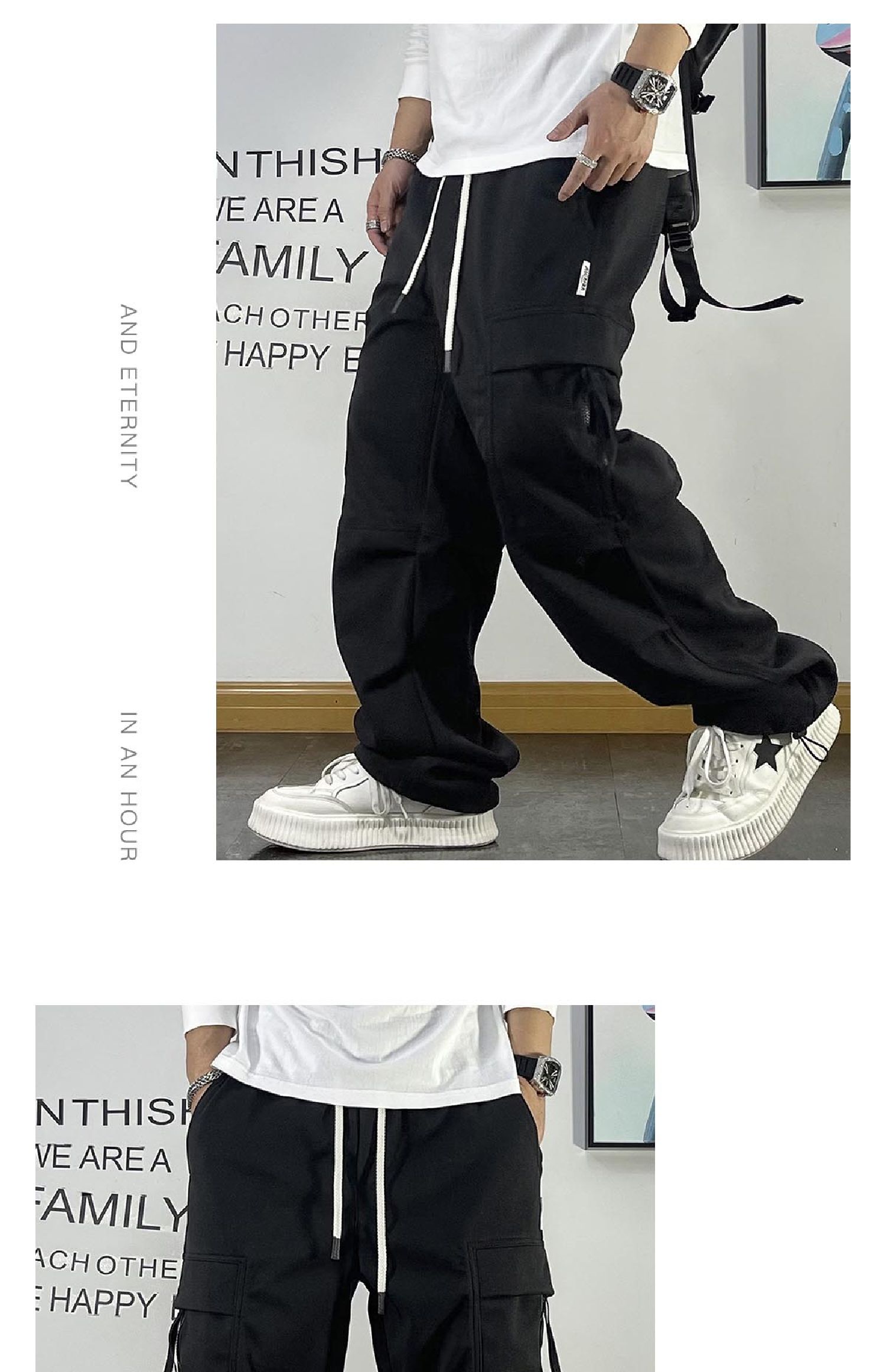 男士多口袋工裝褲寬松直筒街頭潮流傘兵褲春秋款腰帶裝飾休閑褲子