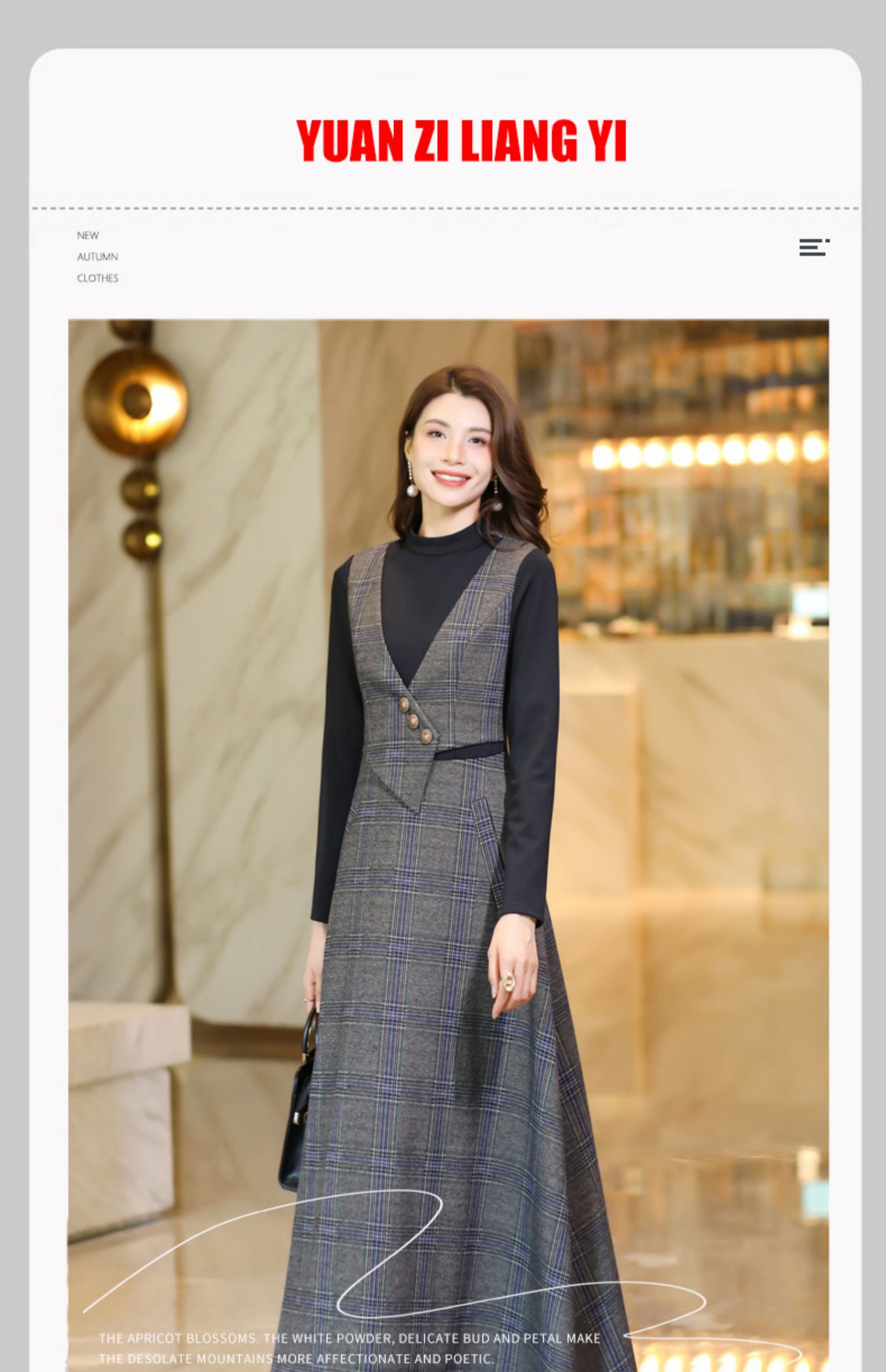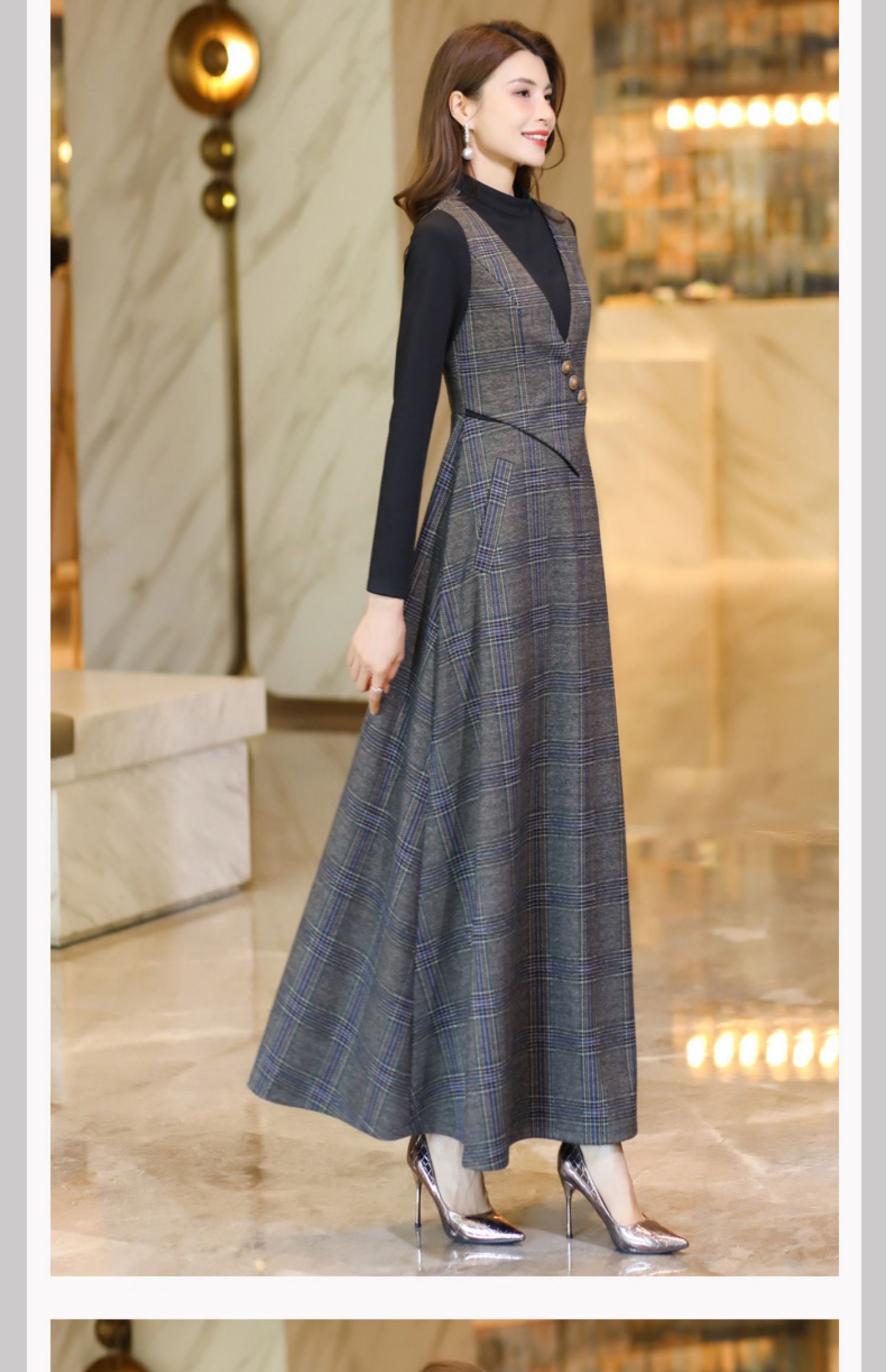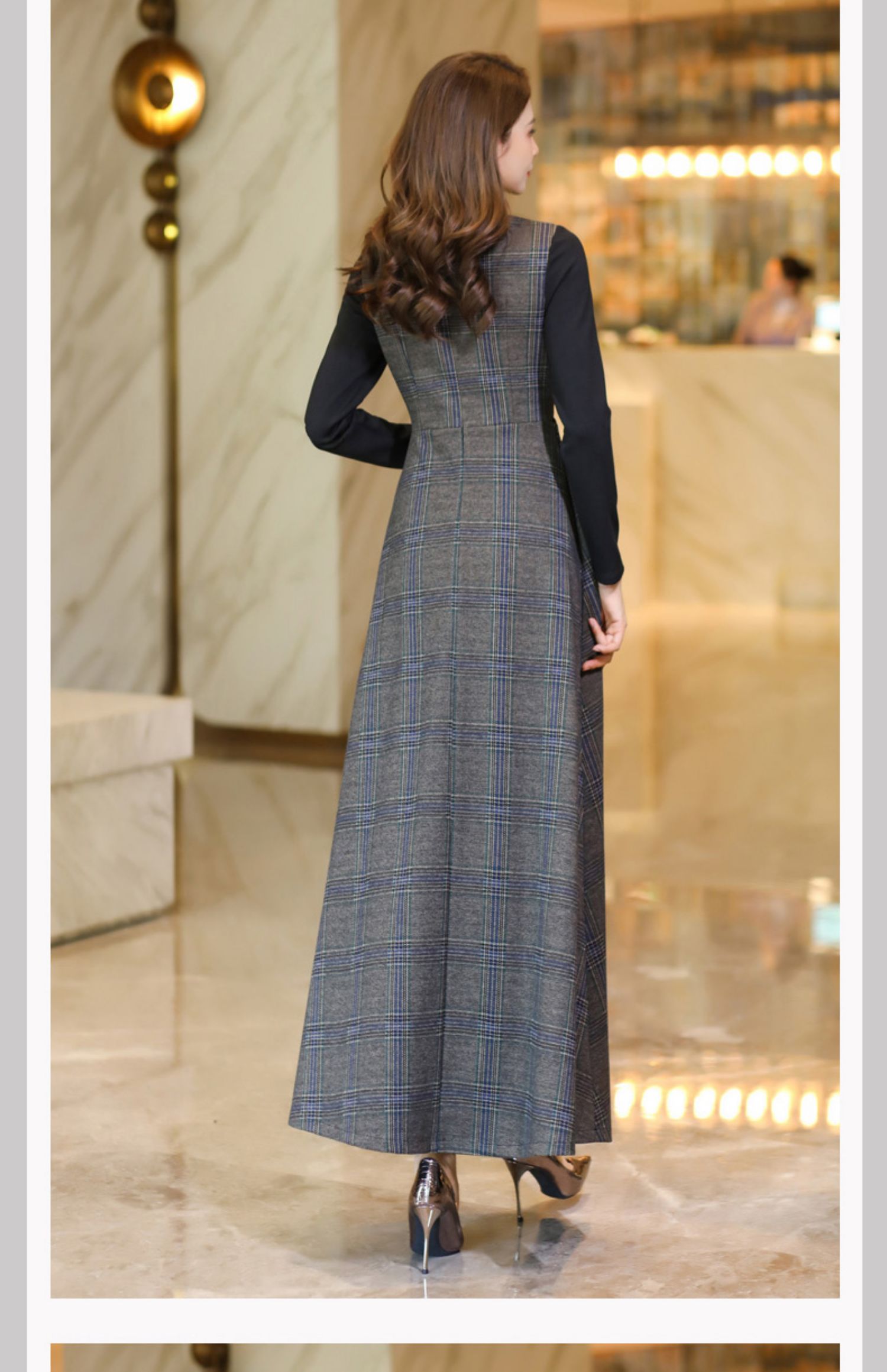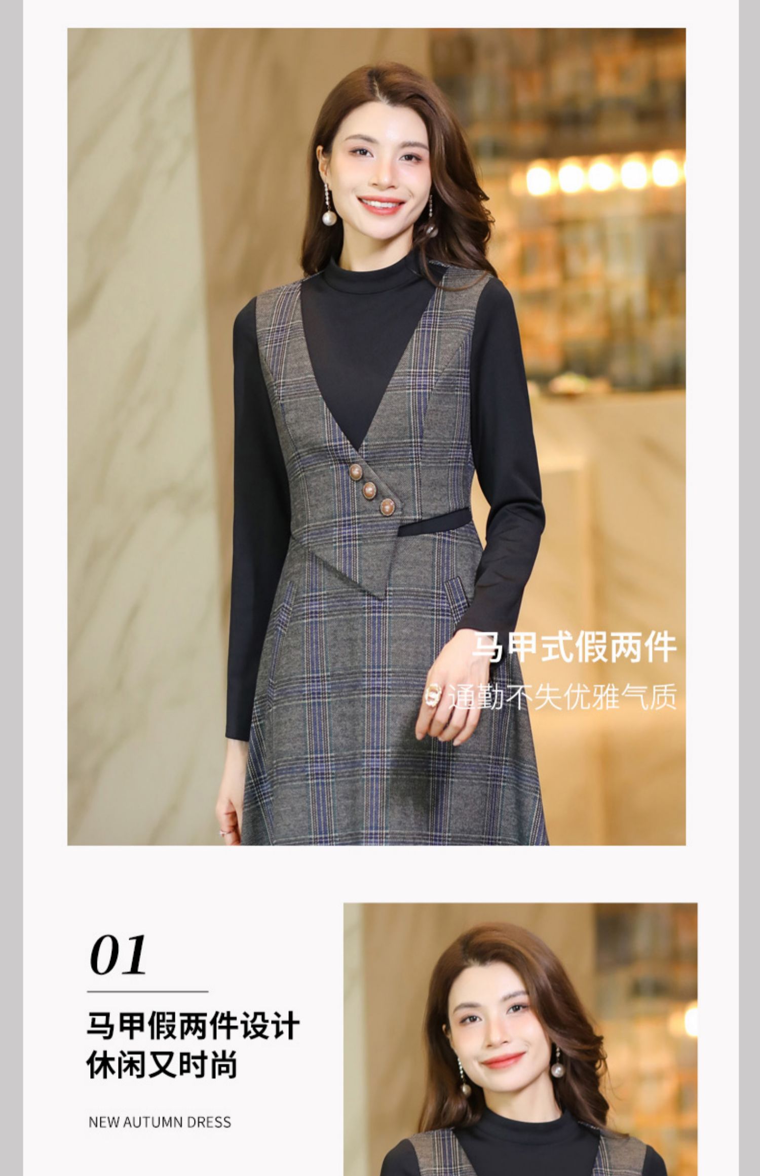 復古格子背心收腰2022春秋到連衣裙