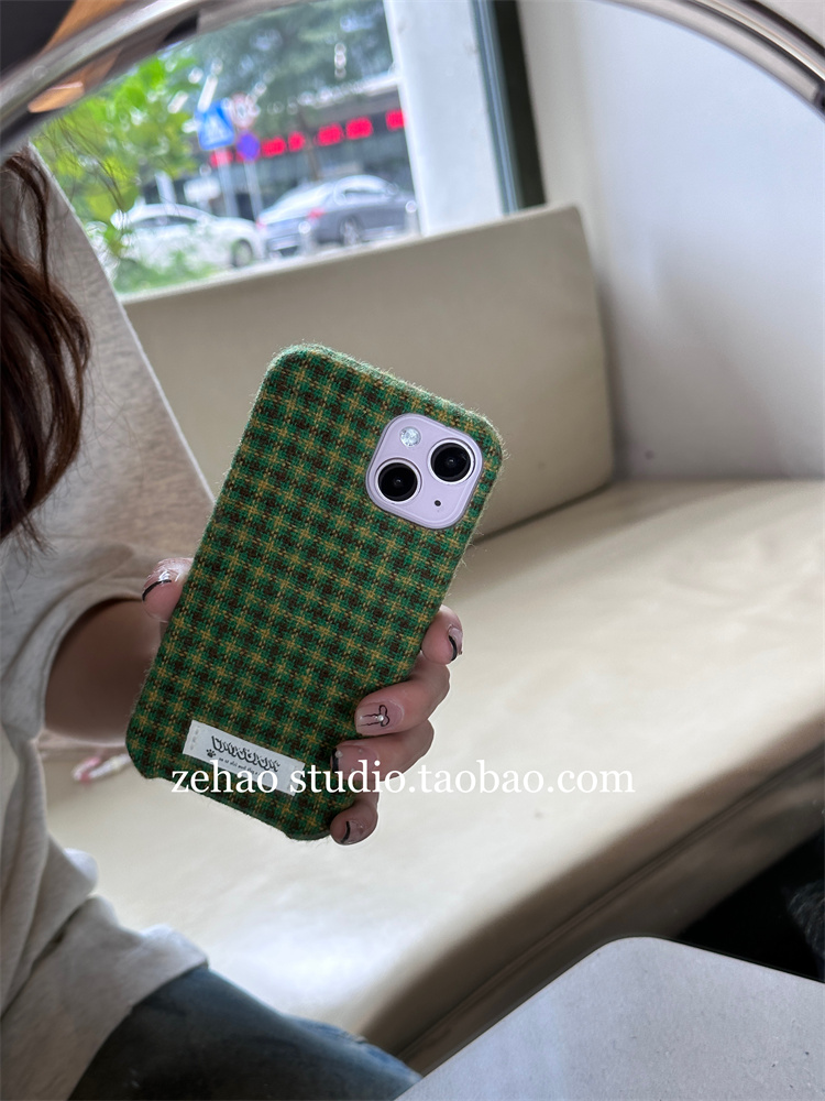 ins風秋冬毛絨復古綠格子適用11蘋果15ProMax手機殼iPhone12全包14新款12Pro韓風可愛軟14Promax防摔保護套13