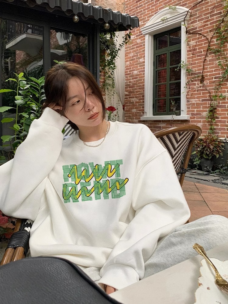 藝術生奶fufu正肩圓領白色衛衣女早秋新款加絨百搭潮流情侶上衣