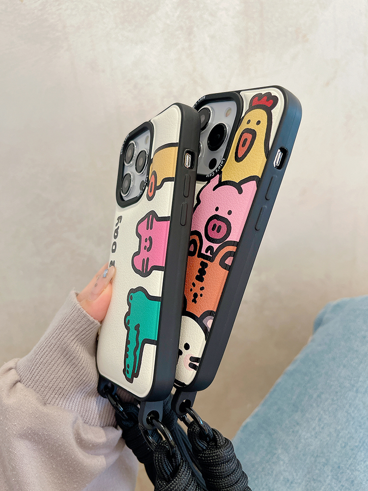 創意卡通插畫斜跨掛繩適用iphone15pro手機殼14promax蘋果13情侶12/x搞怪xr高級xs可愛max/xsmax/8plus/7p/11