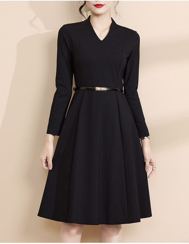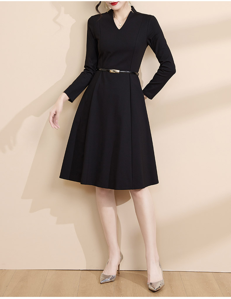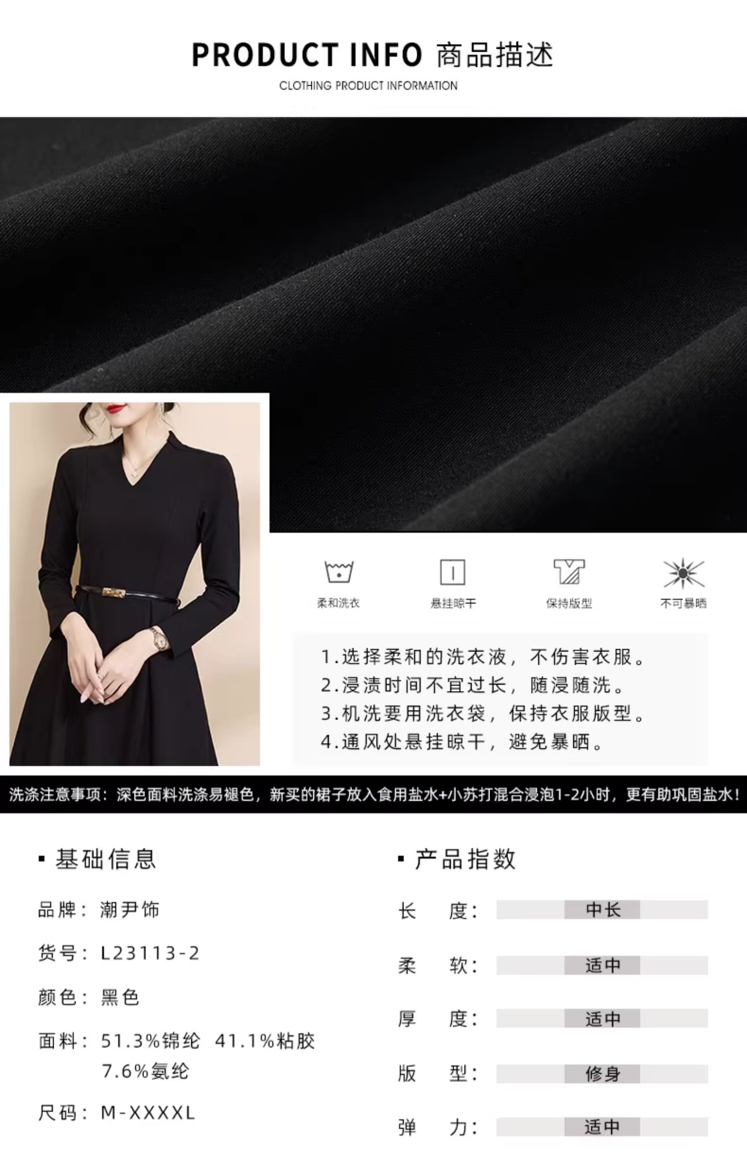 黑色v領連衣裙女長袖2023秋裝新款高級感收腰修身顯瘦氣質中長裙
