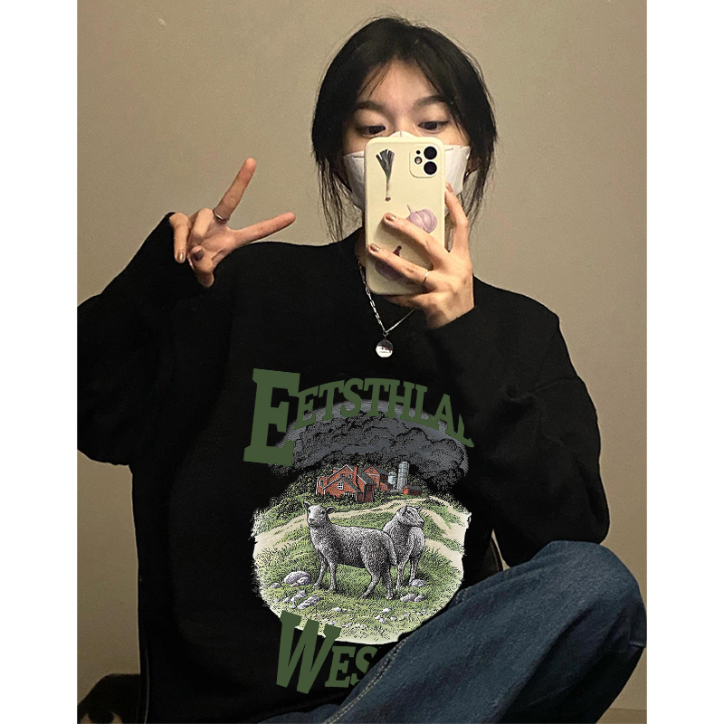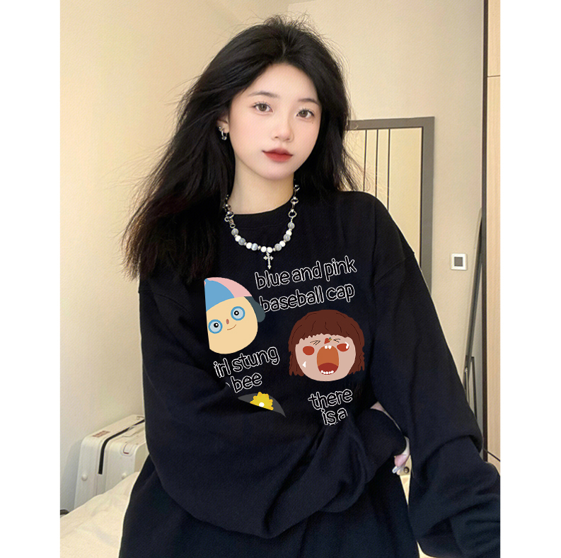 圓領卡通長袖衛衣女美式設計感小眾春秋季寬松大碼百搭外套上衣潮