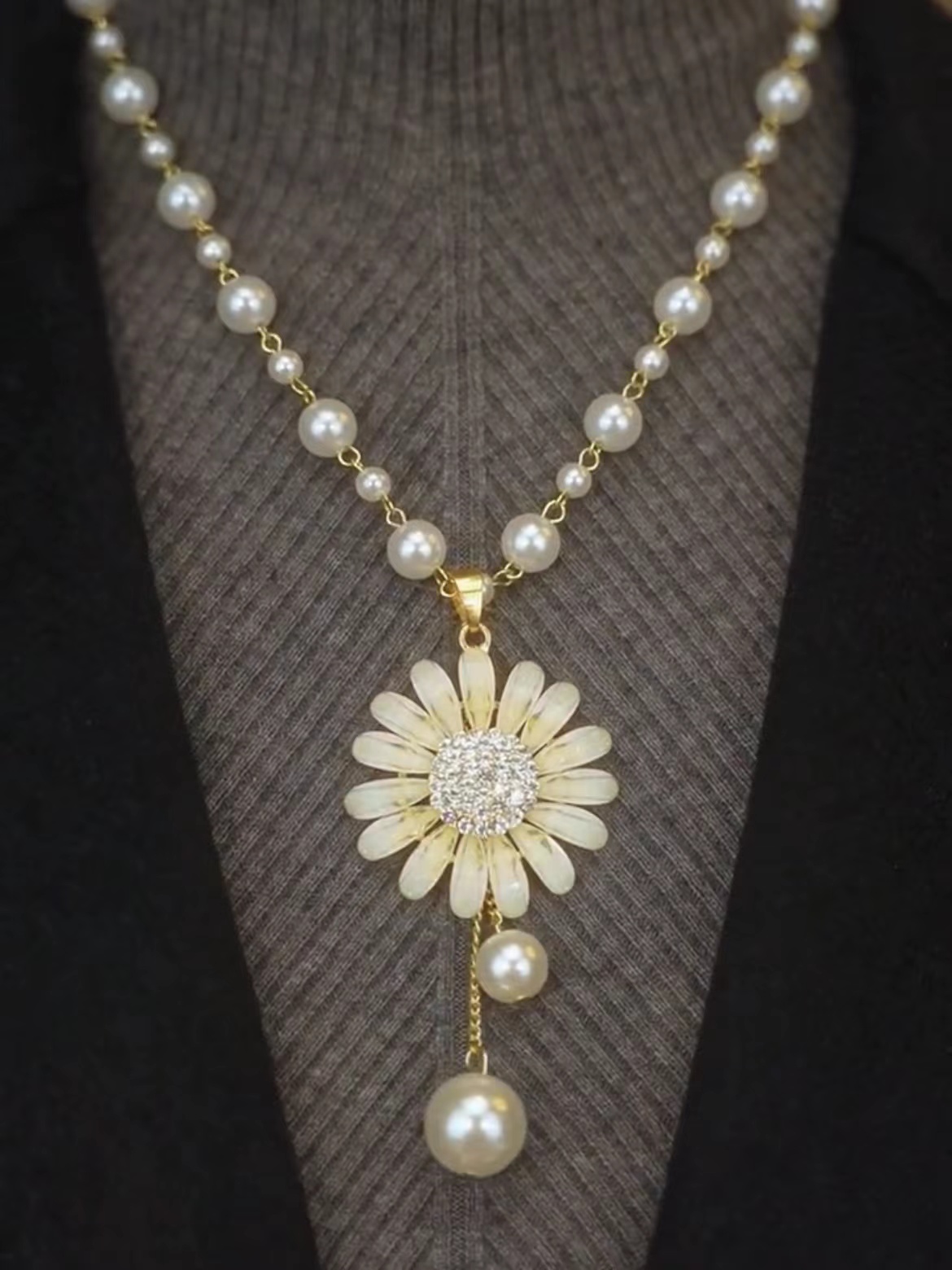 氣質百搭鑲鉆花朵珍珠項鏈輕奢小眾毛衣鏈女2023年新款爆款吊墜掛