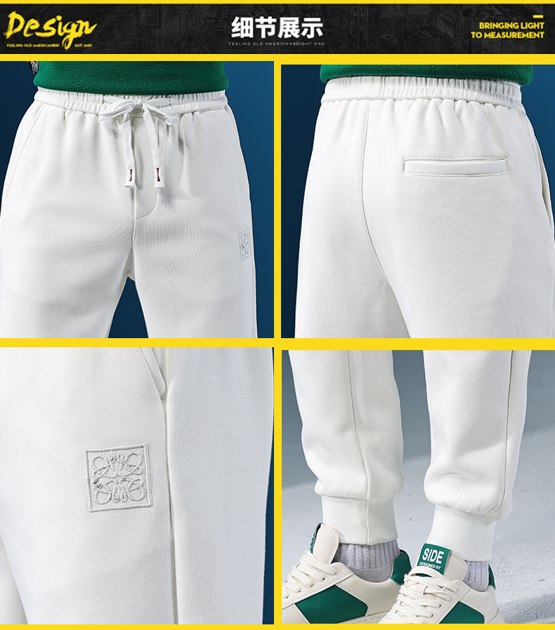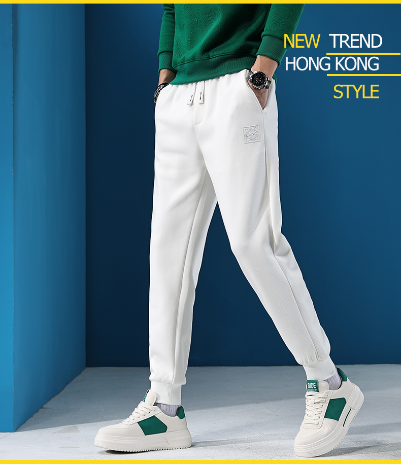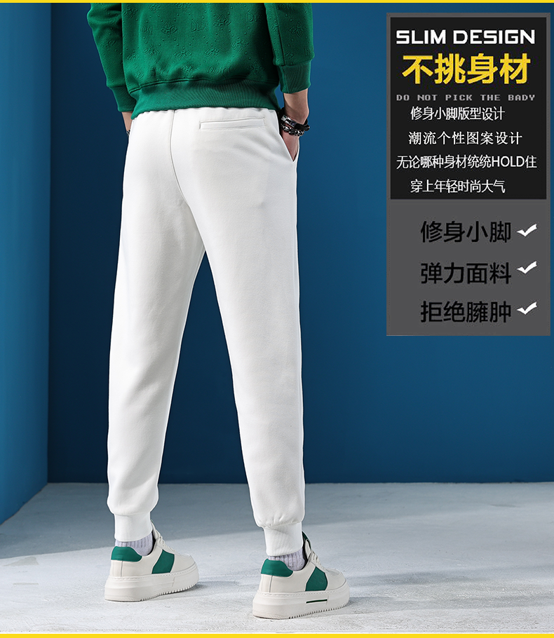 2023秋冬新款純色百搭休閑褲男士秋季厚款束腳運動褲棉料白色衛褲