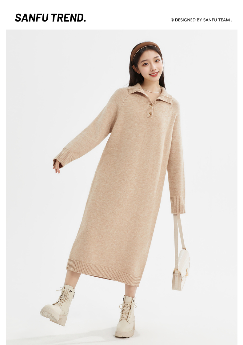 三福連衣裙2023冬純色寬松翻領紐扣H型裙子長裙女裝477359