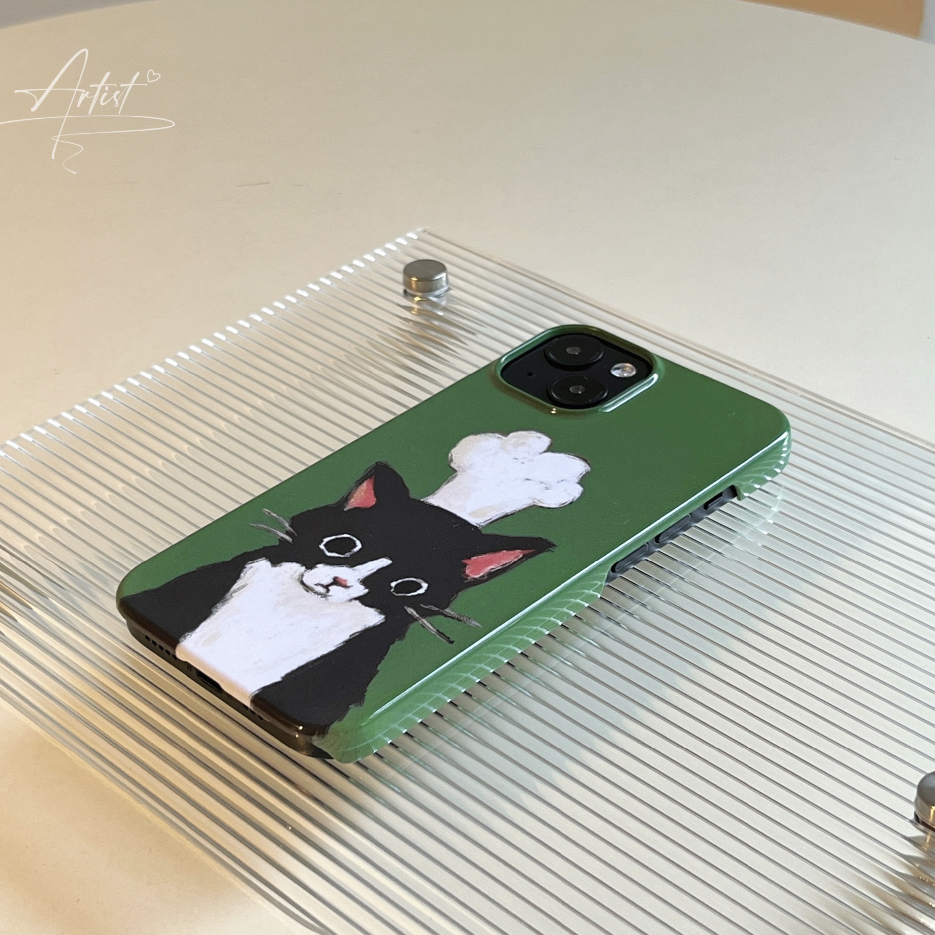 搞怪綠色油畫貓咪菲林殼硬殼適用蘋果14promax手機殼iPhone15pro卡通甜美13pro全包14磨砂ins風14趣味小眾15