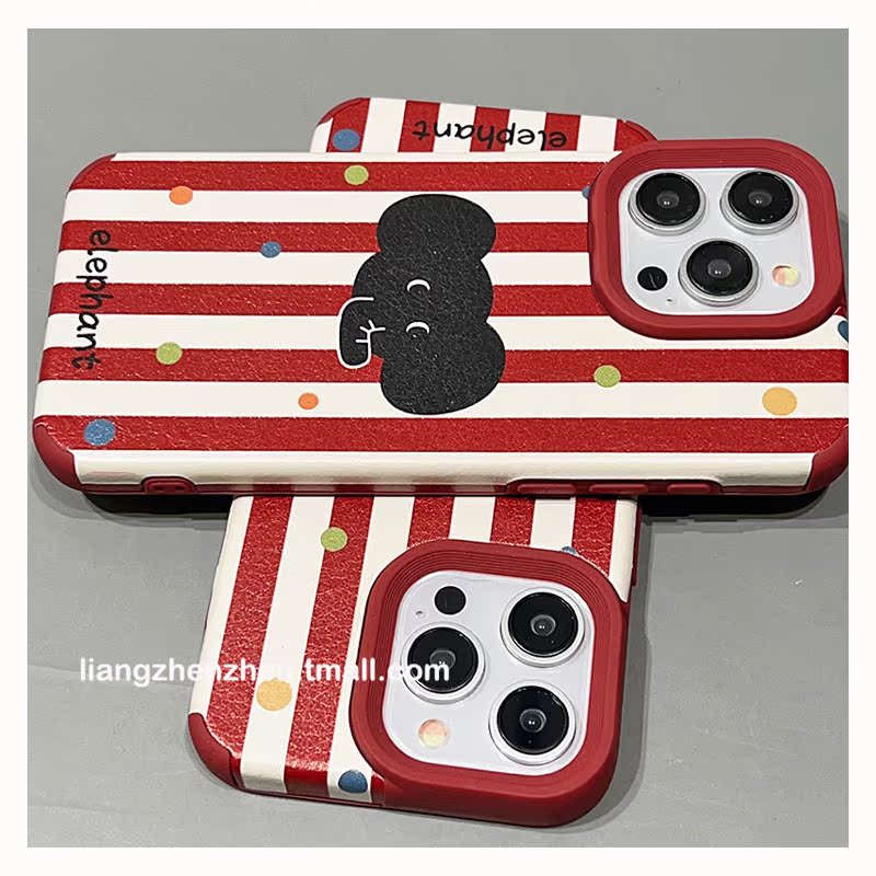 紅色皮質豎紋卡通小象適用蘋果15promax手機殼iphone14女款15pro新款13可愛創意趣味12軟殼pro防摔11硅膠全包